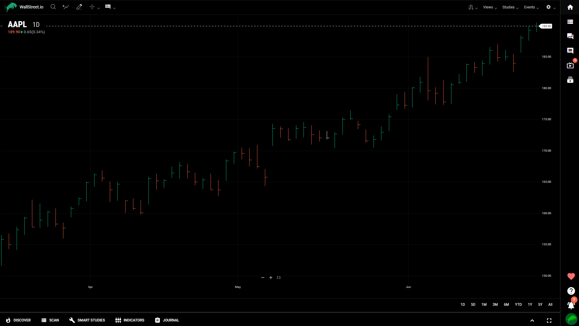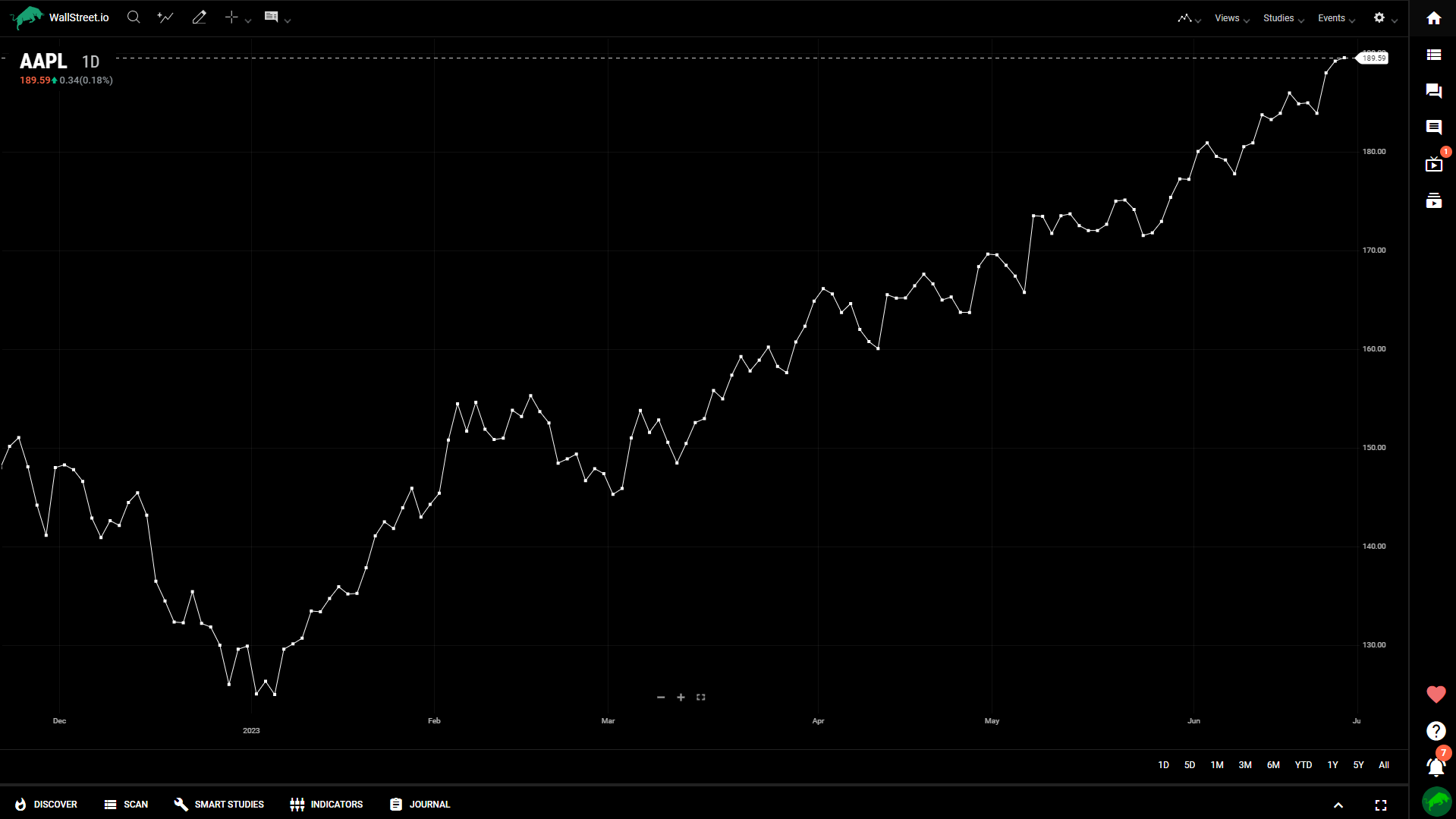 The vertex line chart is a variation of the line chart, representing price data using curved lines. It provides a smooth visualization of price trends and reduces noise from smaller price fluctuations.