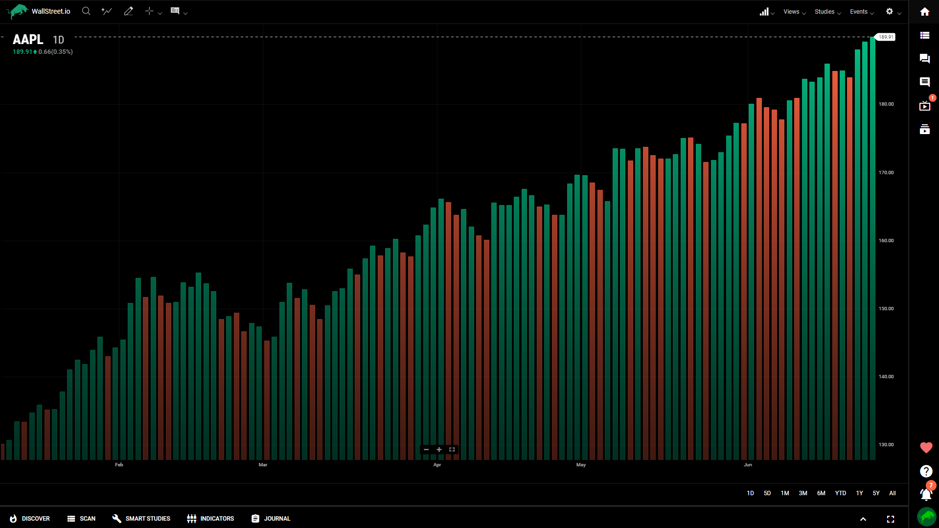 Similar to the bar chart, the colored bar chart uses color-coding to indicate price direction. Rising prices are typically represented with green bars, while falling prices are shown as red bars.