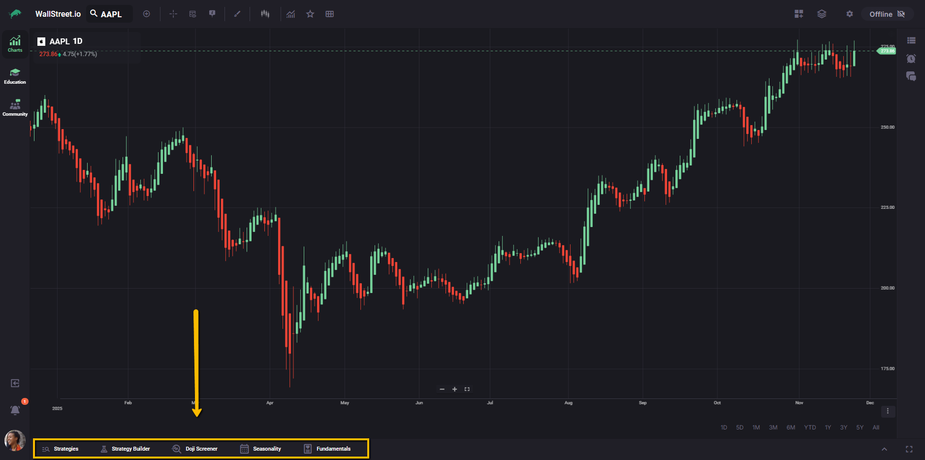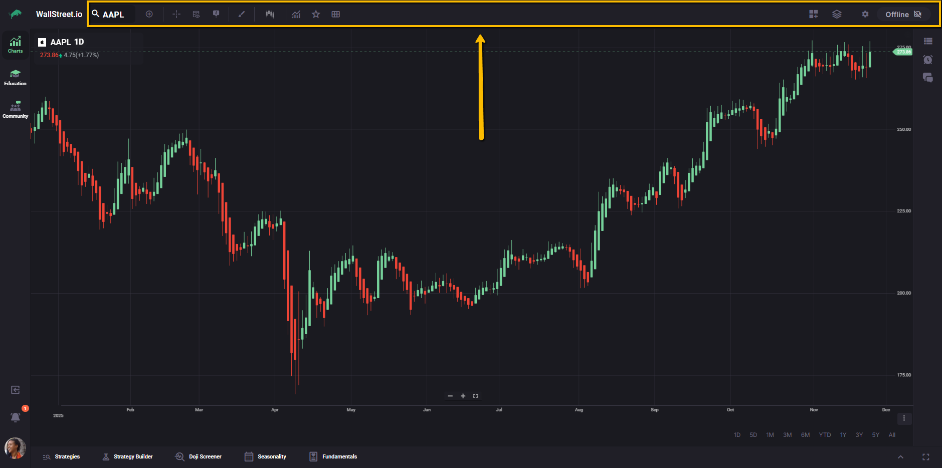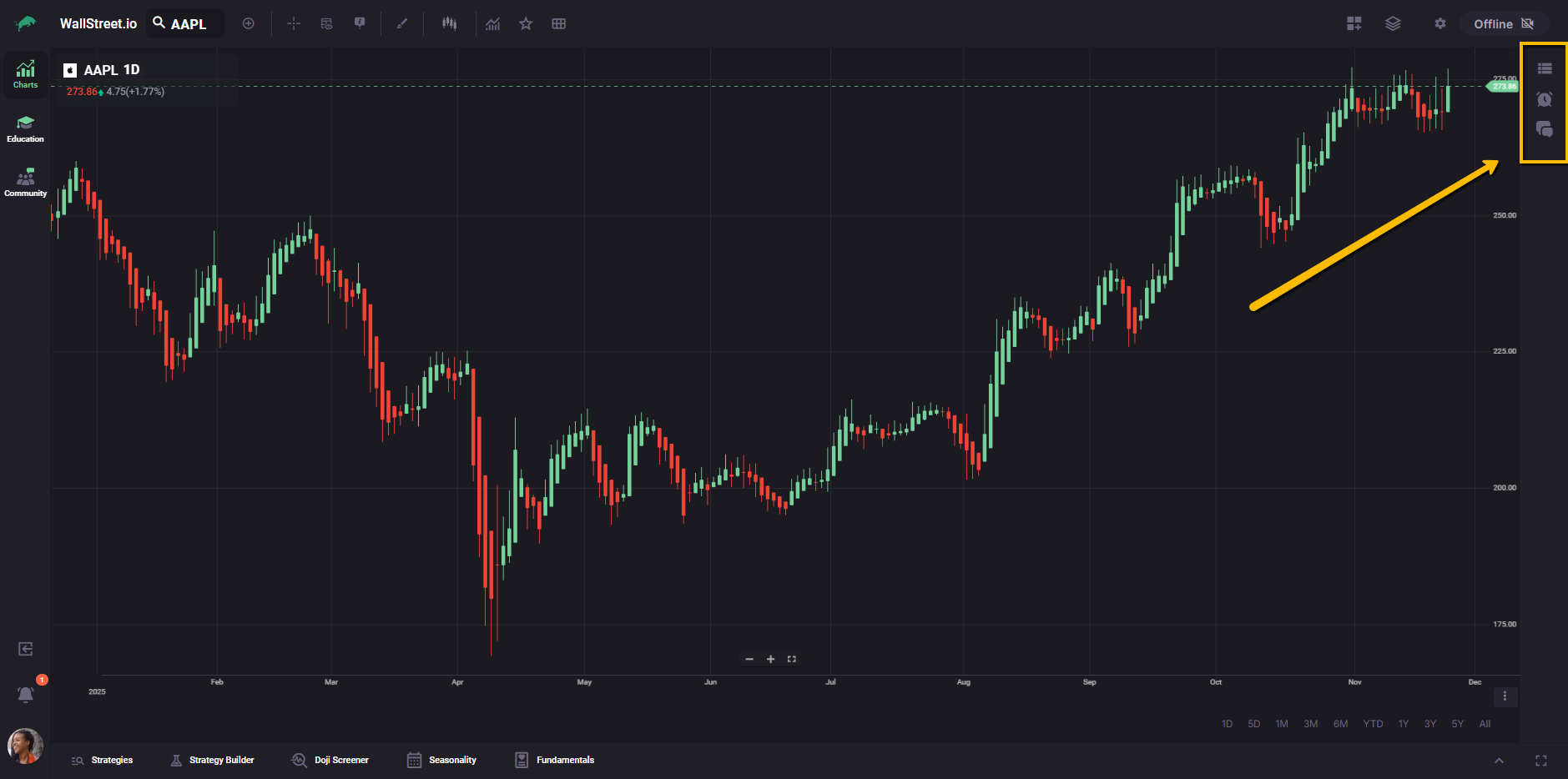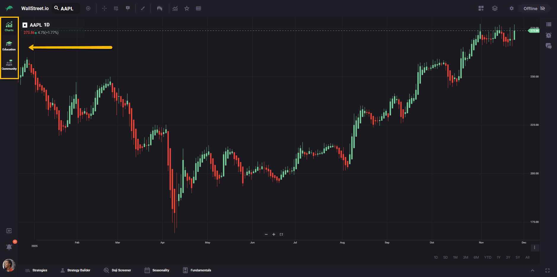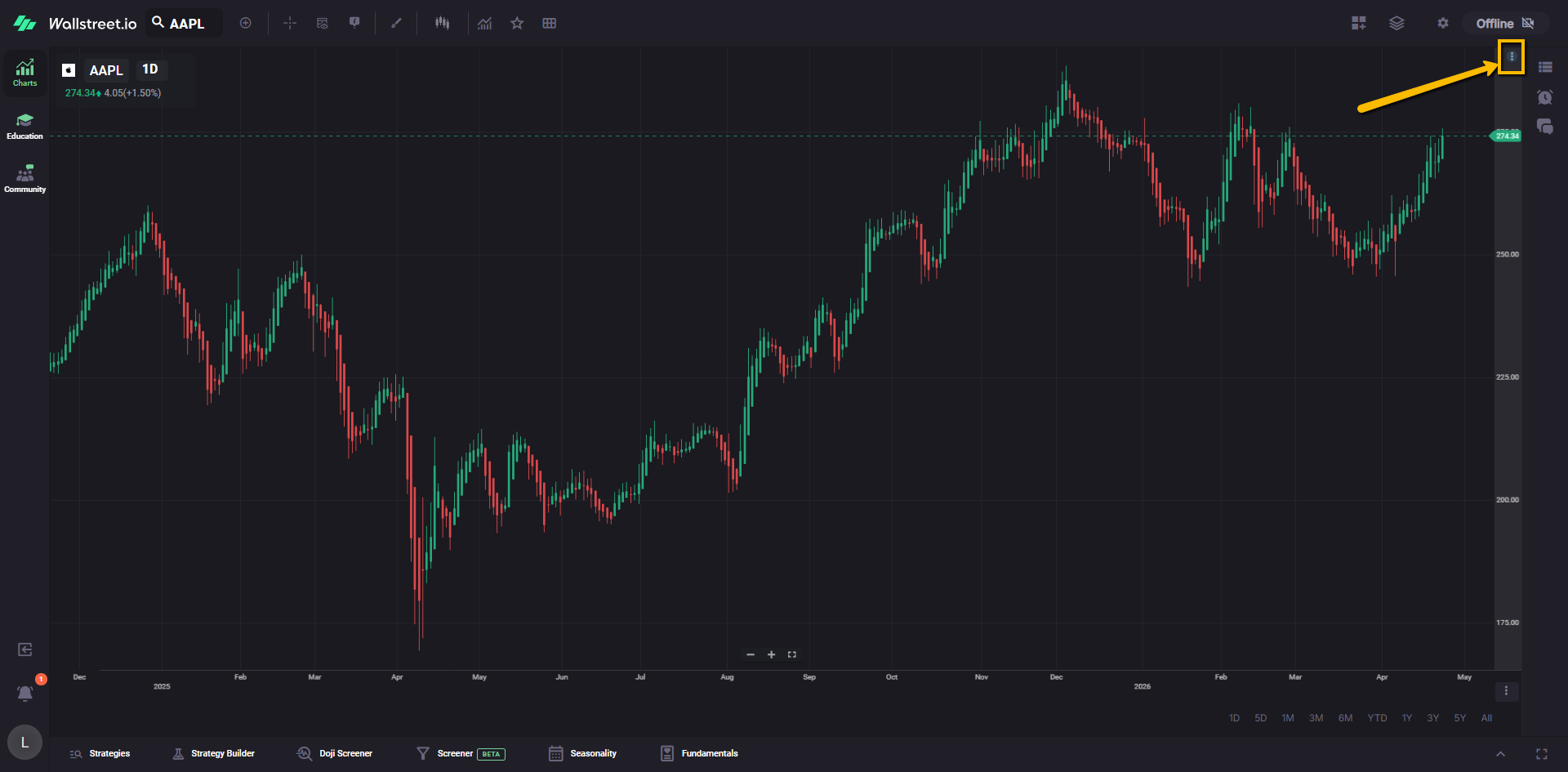 The vertical bar on the left lets you move between the main workspaces on Wallstreet.io: Charts, Education, and Community. This makes it easy to switch from analysis, to learning, to community discussions without leaving your current session.