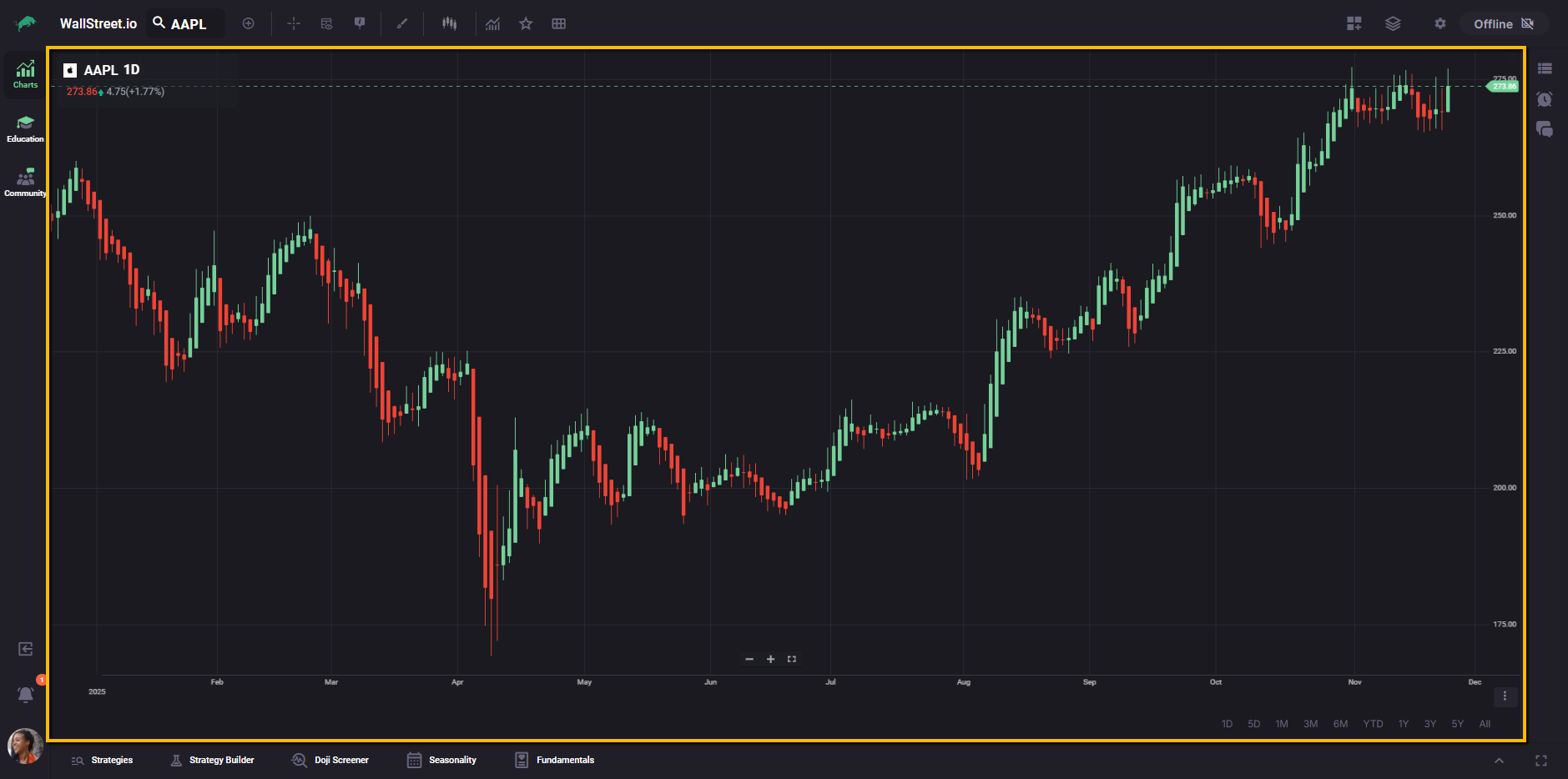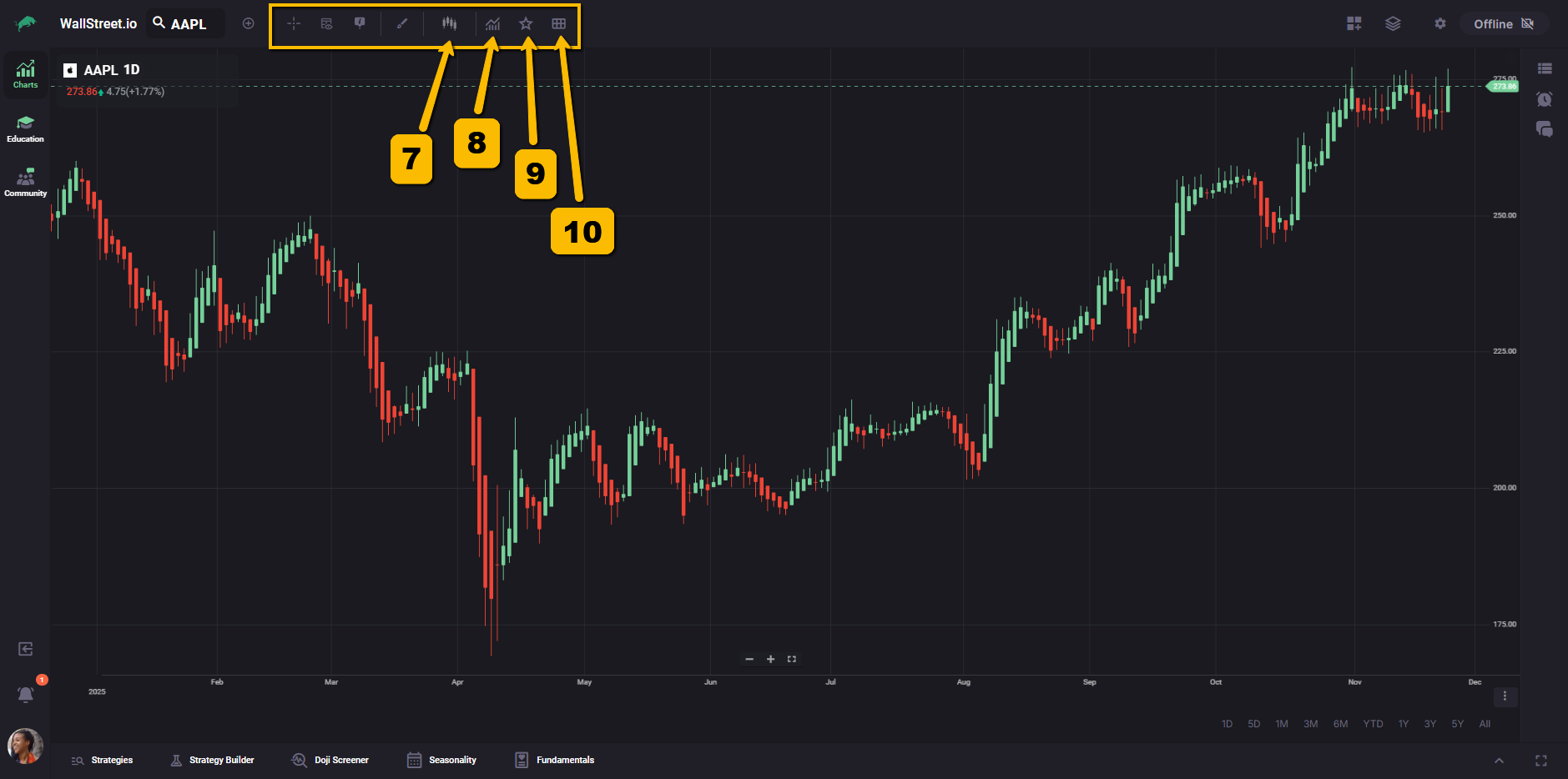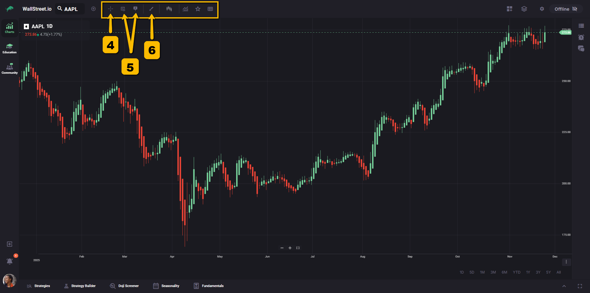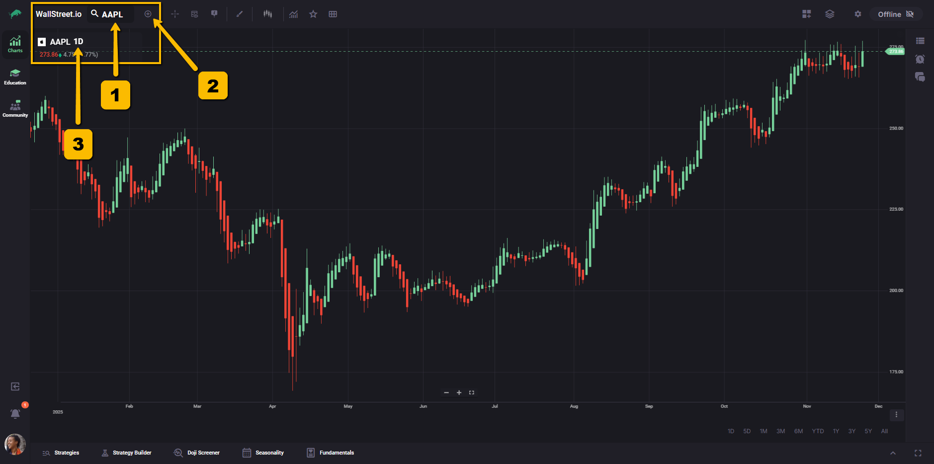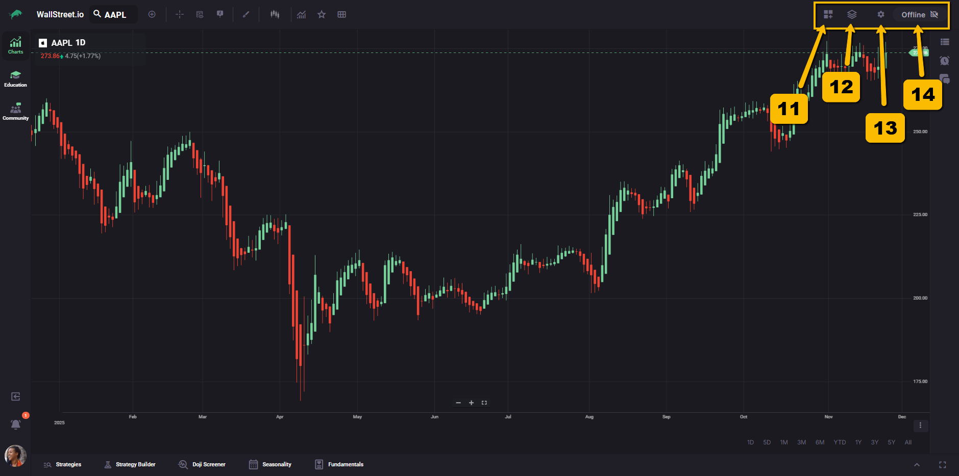The vertical bar on the left lets you move between the main workspaces on Wallstreet.io: Charts, Education, and Community. This makes it easy to switch from analysis, to learning, to community discussions without leaving your current session.