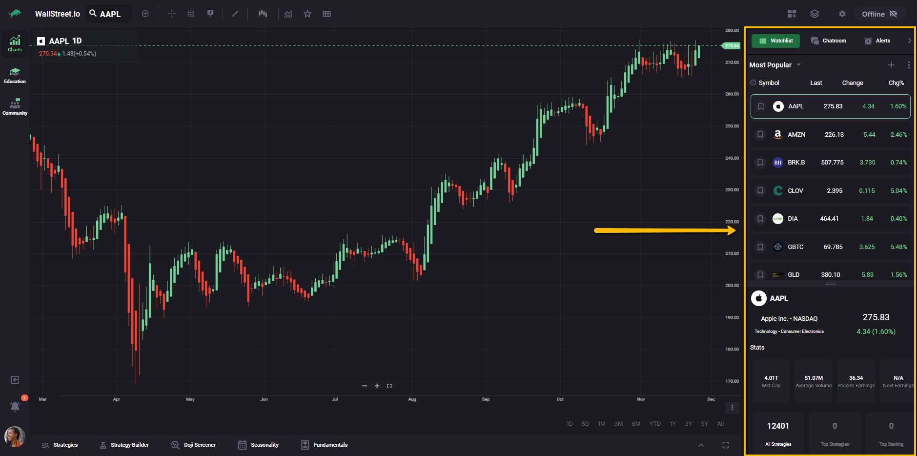 For more information about any of the tools in the Strategy Bar, you can review the complete guides for Strategies, Strategy Builder, Doji Screener, Seasonality, and Fundamentals in the Opportunity Radars section.