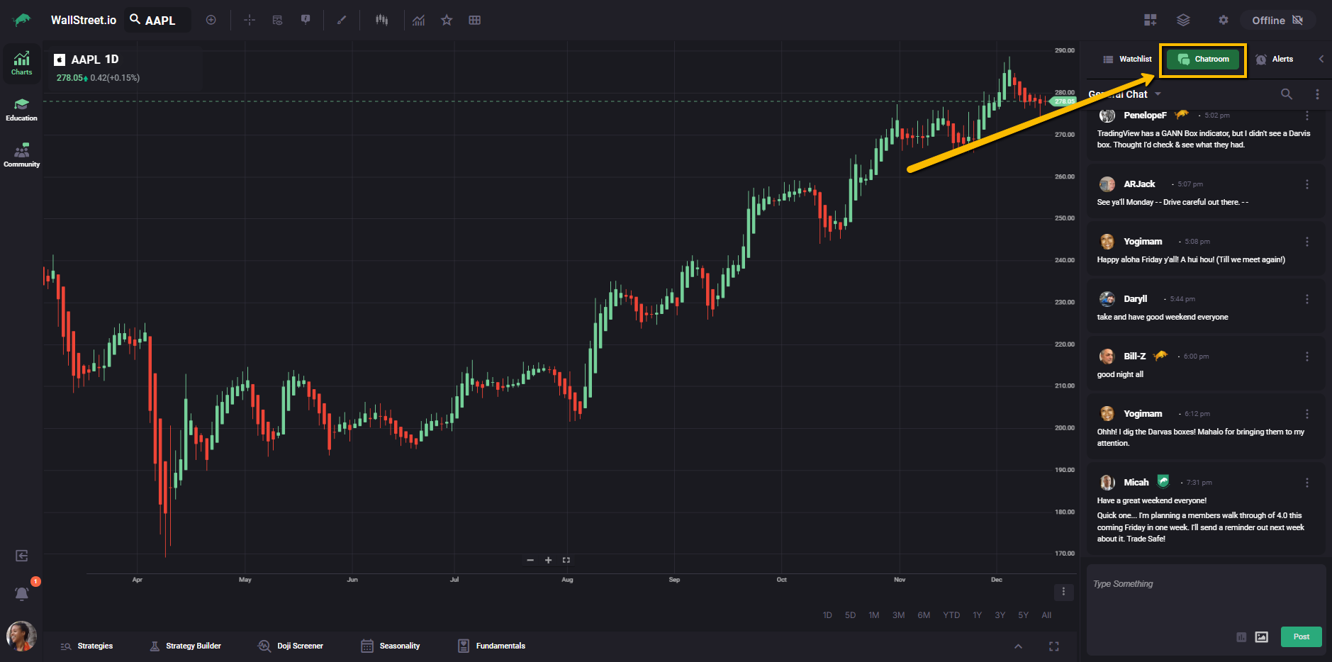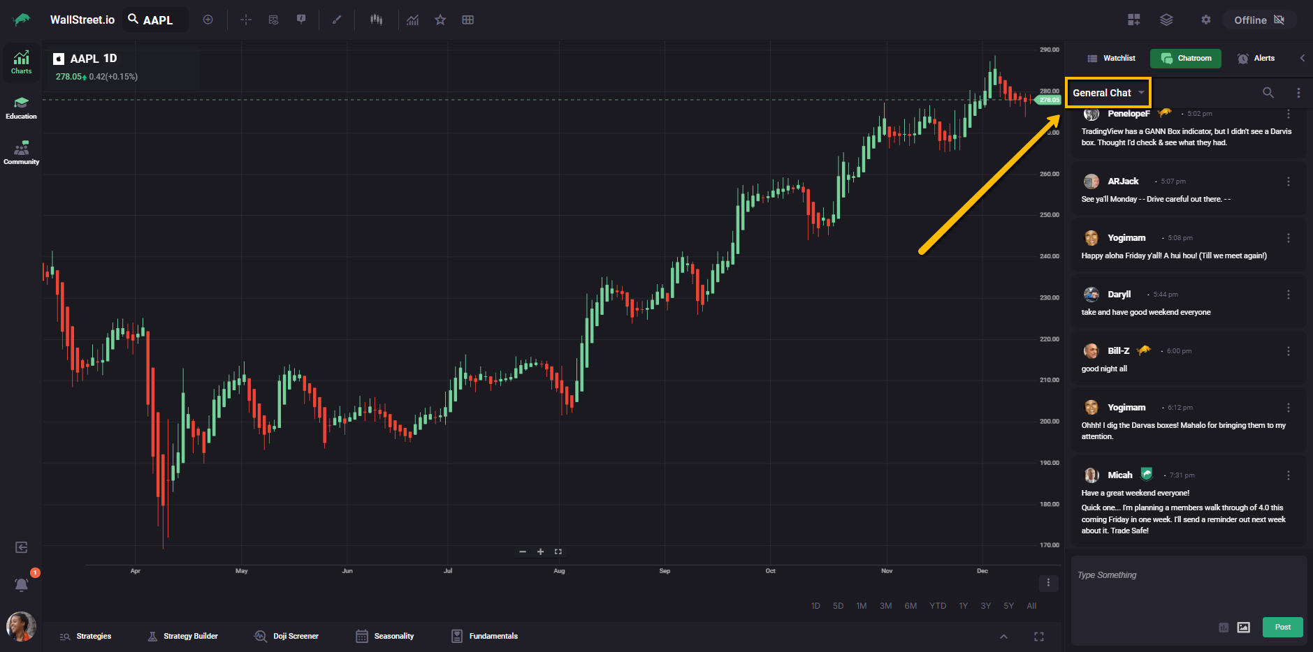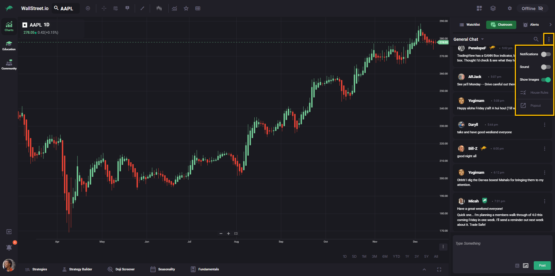 Chatrooms let you talk with other WallStreet.io members in real time while you’re in your Charts Workspace. You can switch between rooms, adjust your chat settings, manage what you see from specific users, and search past messages when you’re trying to find a specific comment or topic.