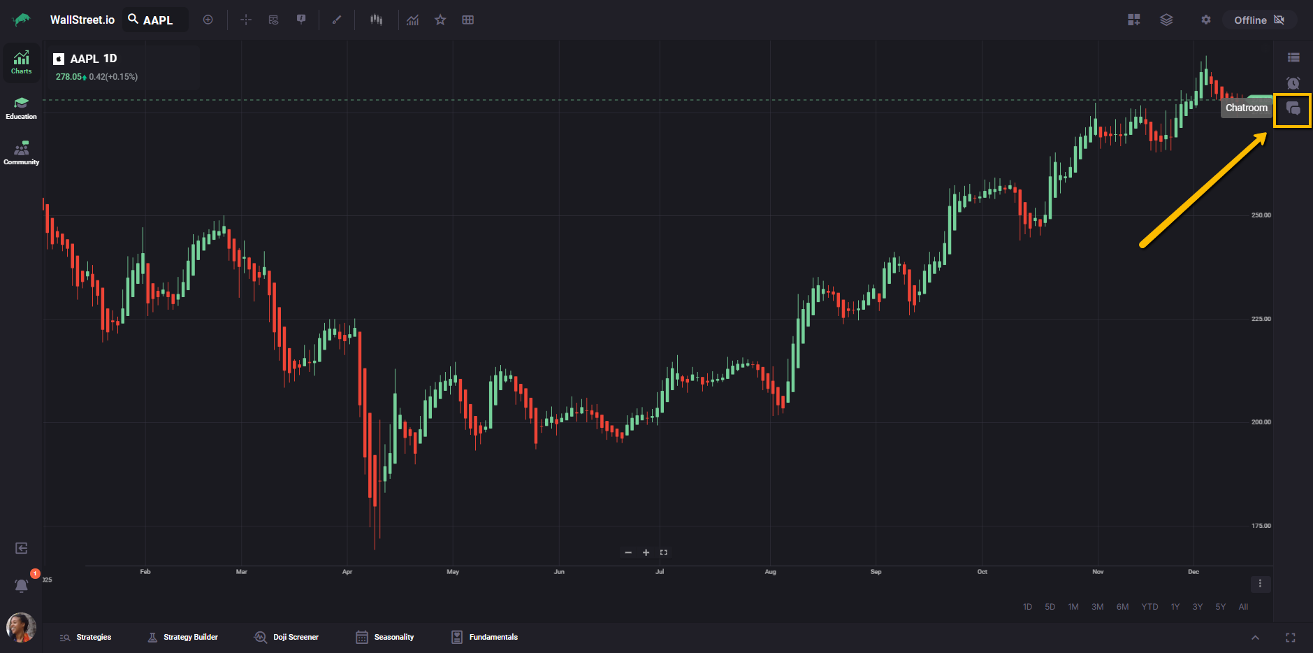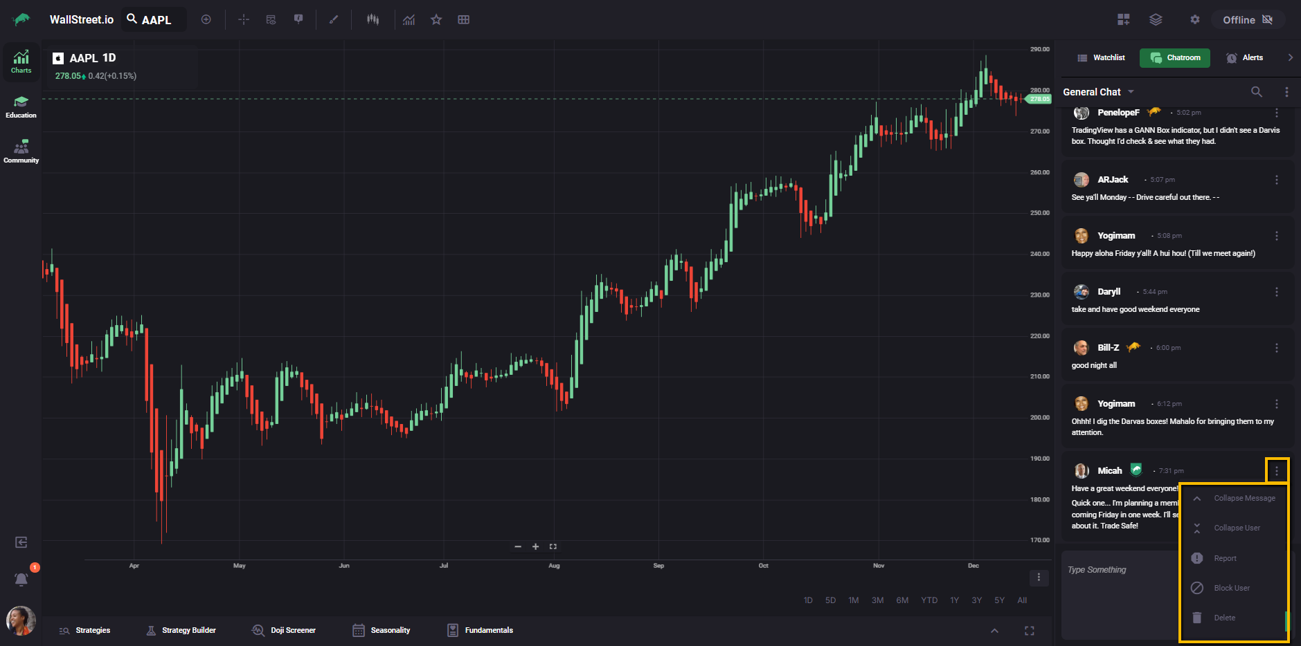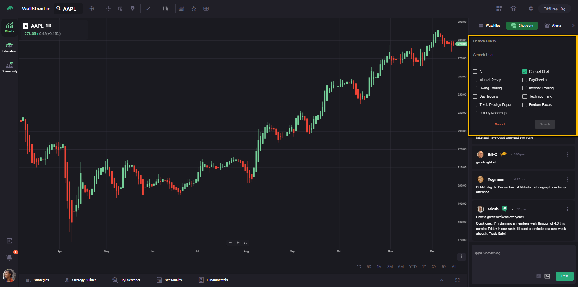 Chatrooms let you talk with other WallStreet.io members in real time while you’re in your Charts Workspace. You can switch between rooms, adjust your chat settings, manage what you see from specific users, and search past messages when you’re trying to find a specific comment or topic.