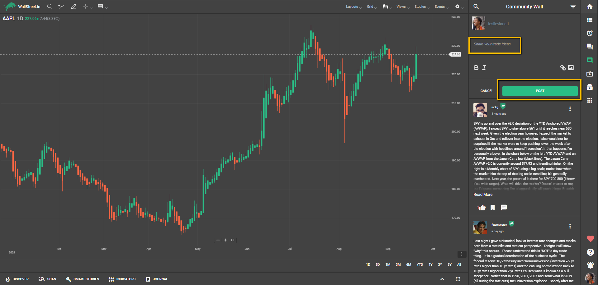 Click on the "Share your trade ideas" box at the top of the Community panel to initiate a new post.Enter your text in the provided text box, using the formatting options available. Choose between bold or italic styles to emphasize specific text.Select the appropriate heading type, such as heading, title, subheading, or paragraph, to structure your post effectively.Click on the green Post button to publish.