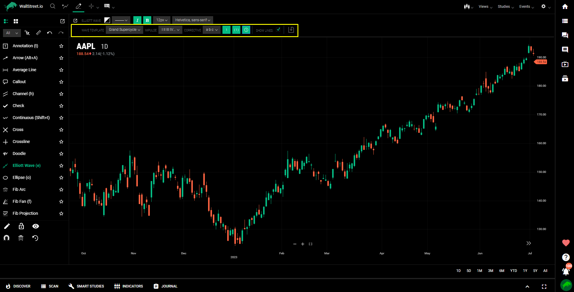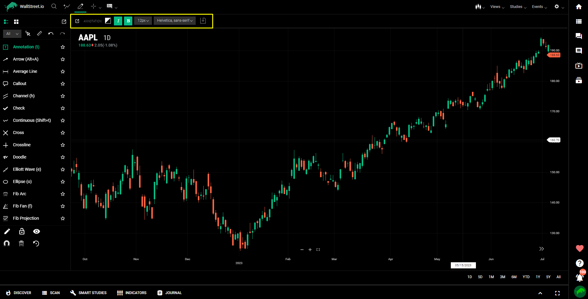 With our extensive drawing and styling tools, including trend lines, average lines, channels, Fibonacci retracements, arrows, callouts, and doodles, you can confidently highlight and graphically analyze charts and studies creatively.