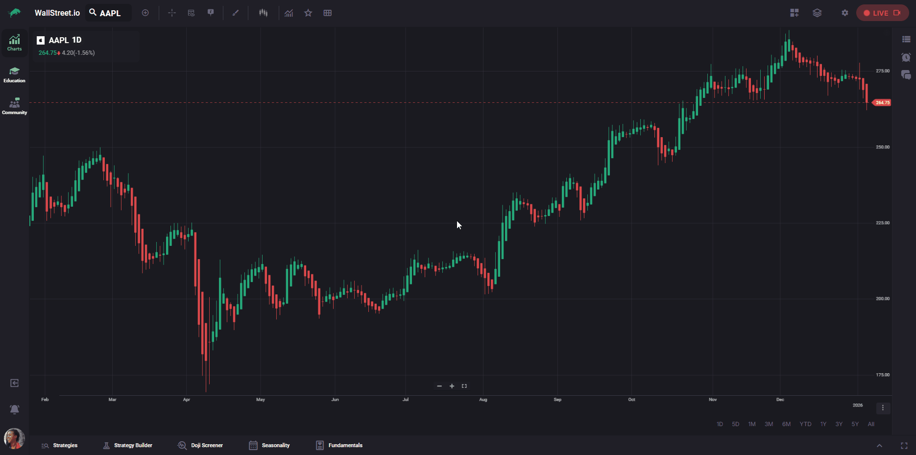 When you select a trade here, Wallstreet.io links that trade to the chart. This selection is what unlocks the trade-related details you will see in the Heads-Up (floating info) tooltip when you hover over the chart.