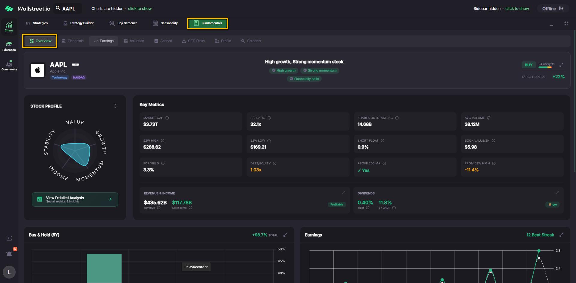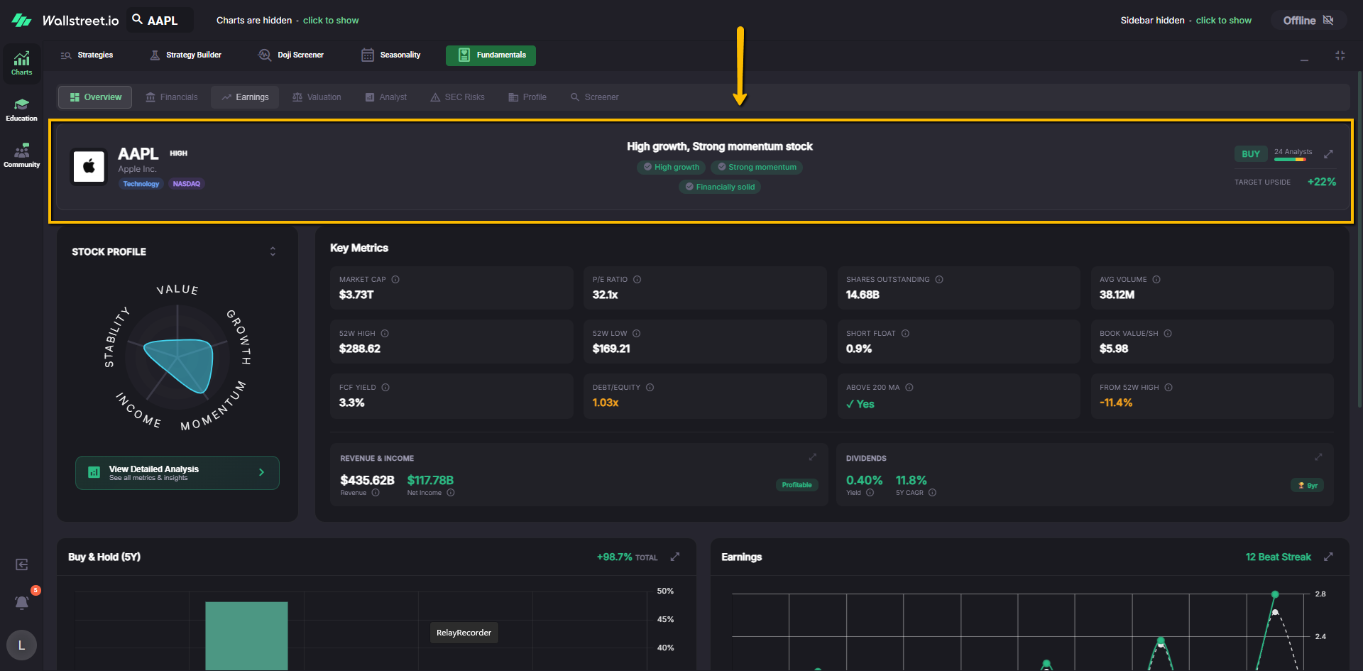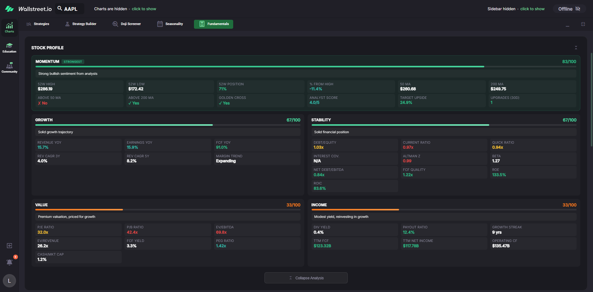 You use it to see how a company scores across growth, value, stability, income, and momentum, then drill into earnings quality, cash flow, valuation, and analyst expectations without leaving Wallstreet.io.