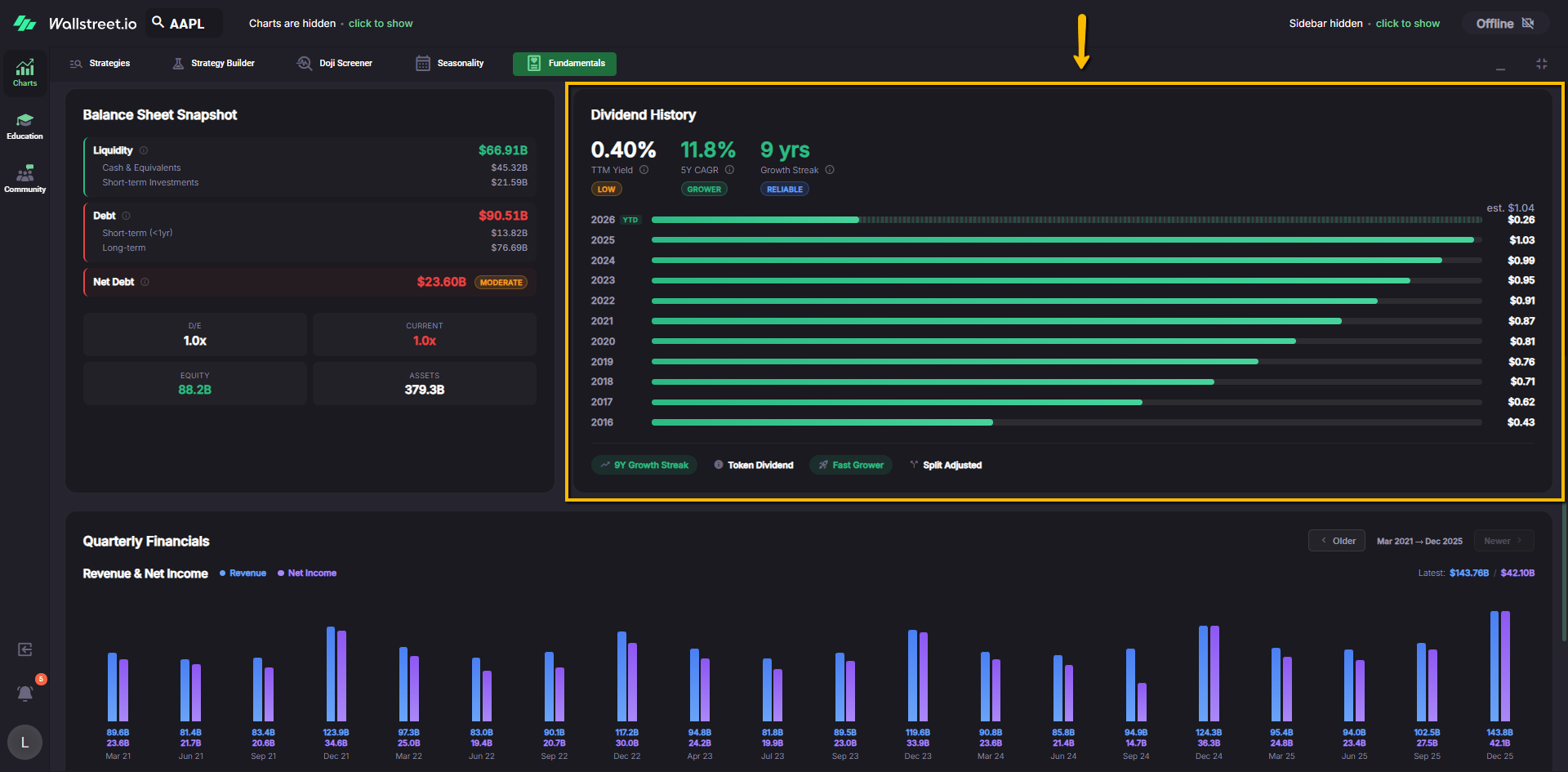 Next to Revenue & Income you will see a Dividends panel that focuses on: