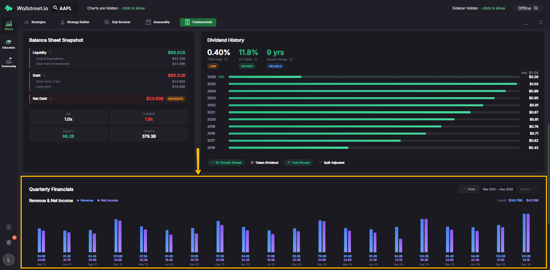 The Quarterly Financials section charts Revenue and Net Income by quarter. Navigation controls (Older / Newer) let you move through time when the history is longer than the visible window.