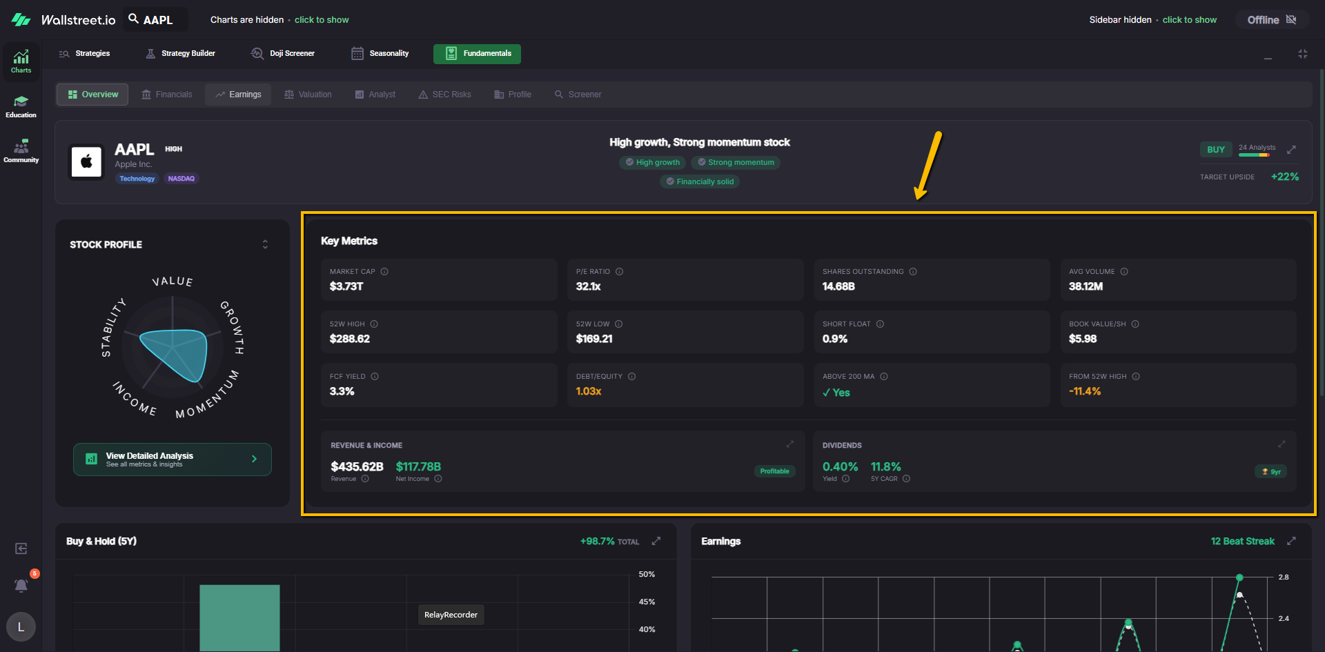 To the right of the Stock Profile you will see a grid of Key Metrics. Examples include: