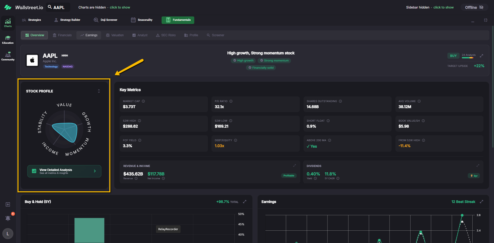 On the left you will see the Stock Profile spider chart. It scores the stock across five dimensions: