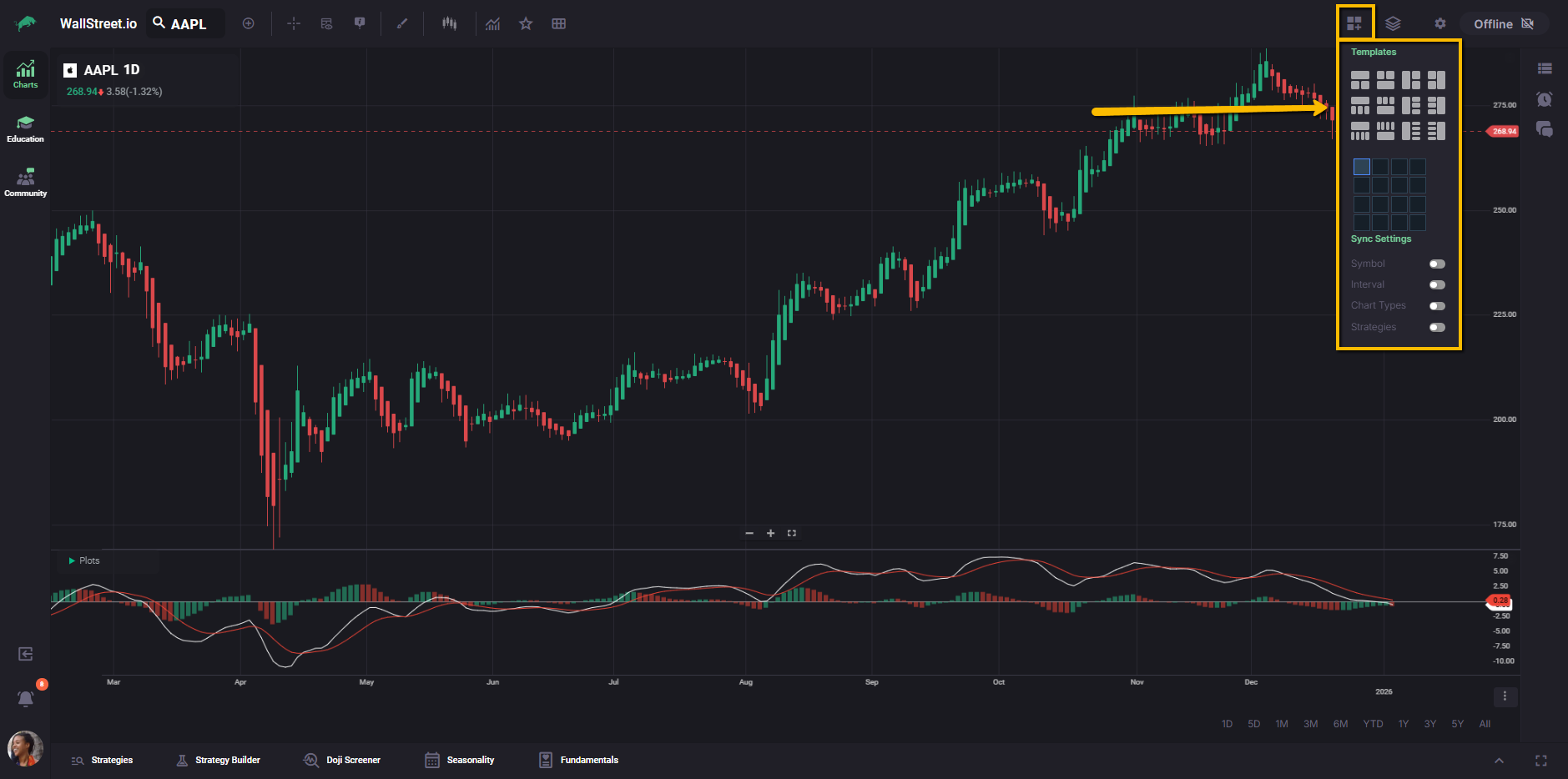 | Strategies | The selected strategy overlay | Applying a strategy in one chart applies that strategy selection across the other charts. |