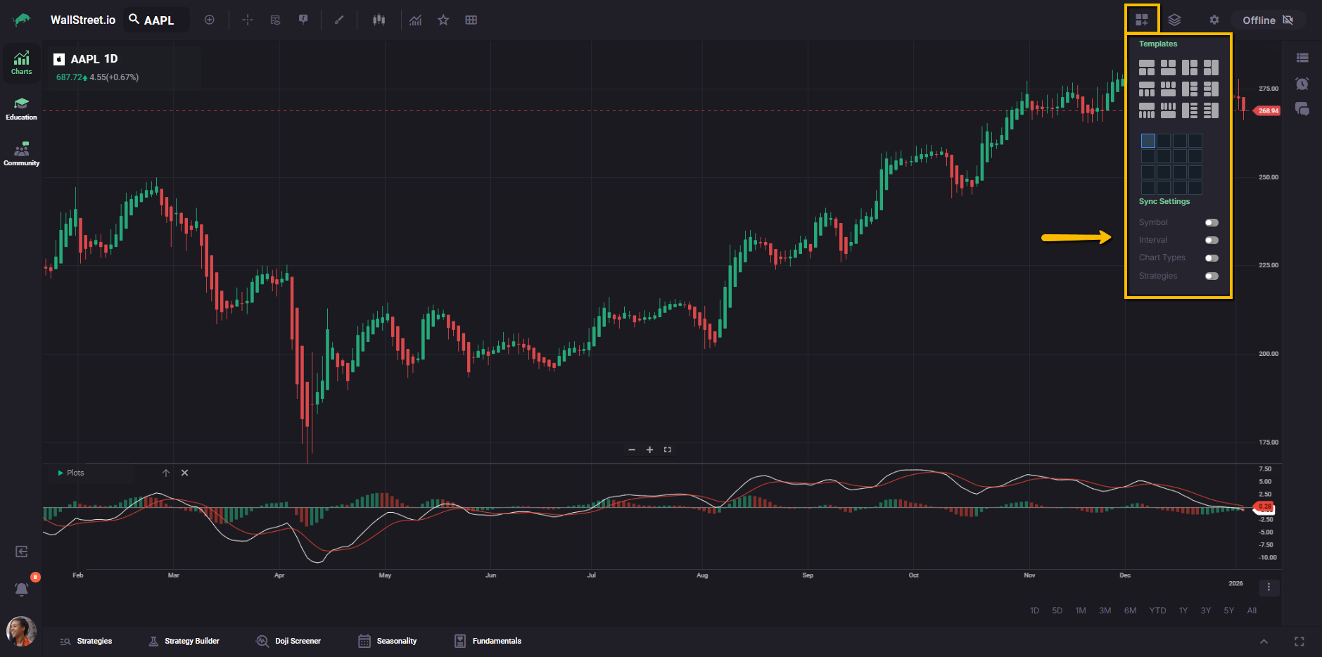 Templates represent arrangements only. Each chart inside the grid can still carry its own symbol, timeframe, indicators, and strategy overlay unless you use sync settings.