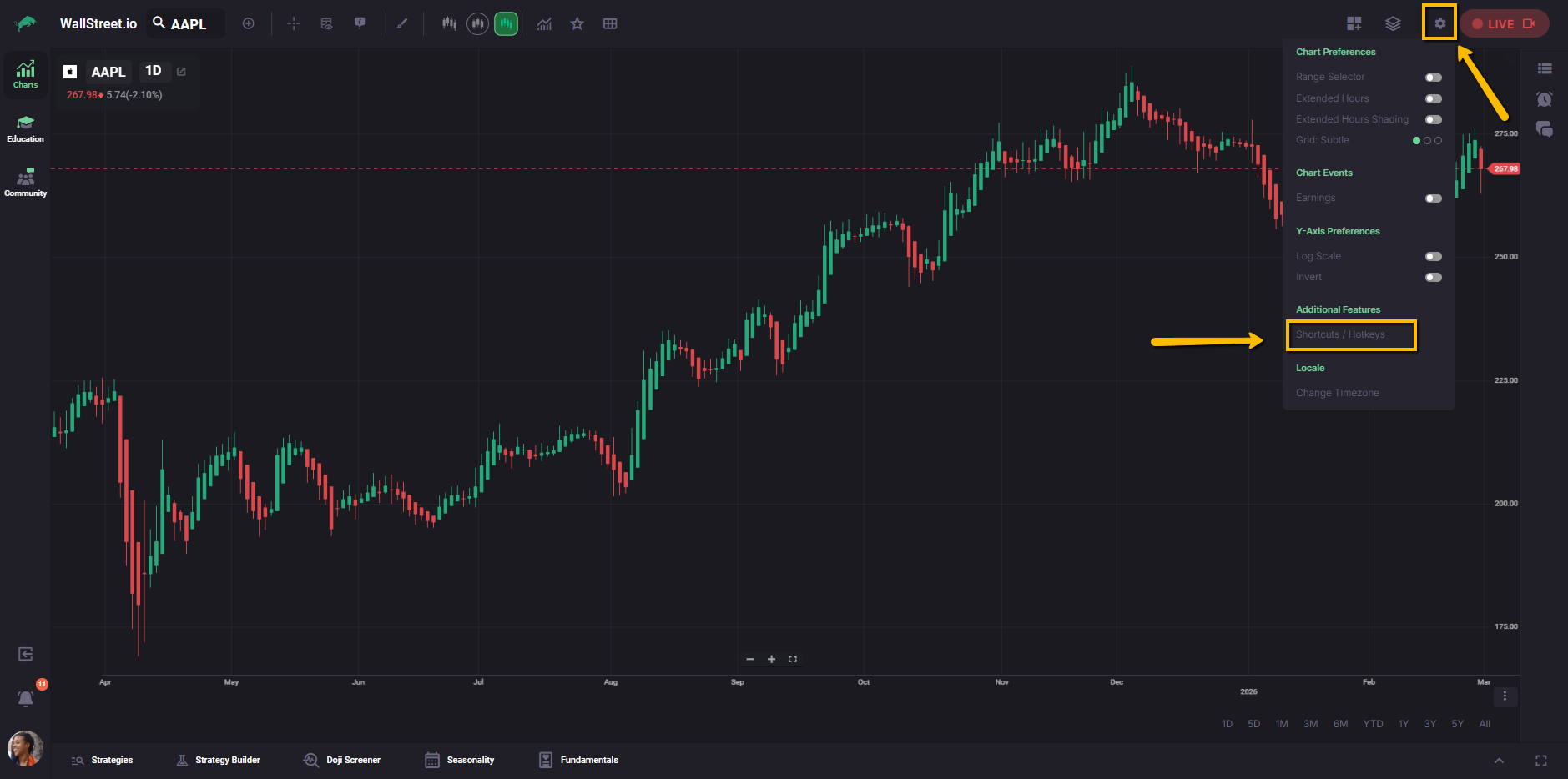 Open any chart, then click Settings (gear icon) in the top-right of the chart, and click on Shortcuts / Hotkeys to open the Shortcuts panel.