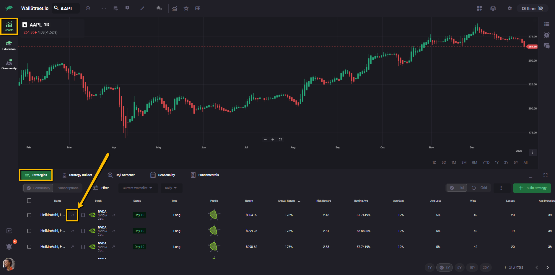 Next to the strategy name, click the arrow icon that points up-left. This opens the strategy inside the Strategy Builder.