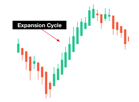 On a Heikin-Ashi chart, a PayDay Cycle is simply a series of same-color candles moving in one direction.