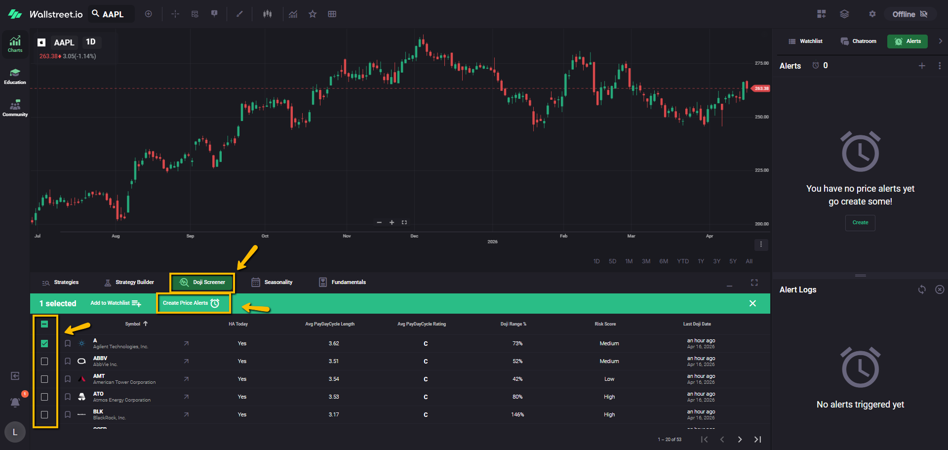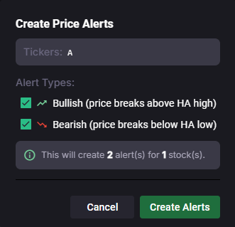 A Price Alert notifies you when a symbol hits a price level you set, using a condition like Greater than or Less than. Alerts can be created manually from the Alerts panel, created directly from the chart, or generated automatically as One-Click Doji Price Alerts from the Doji Screener. All alert types appear in the same Alerts list.