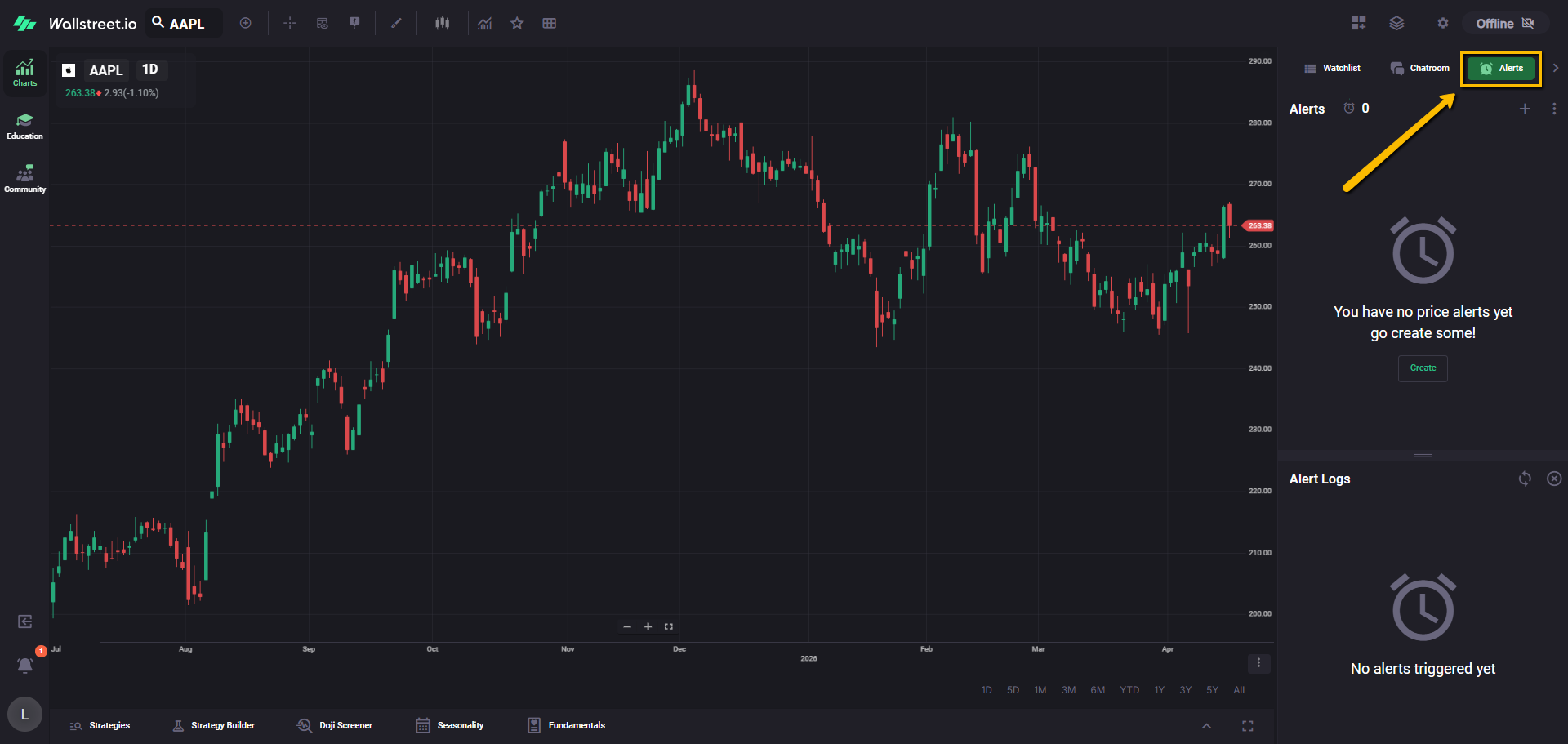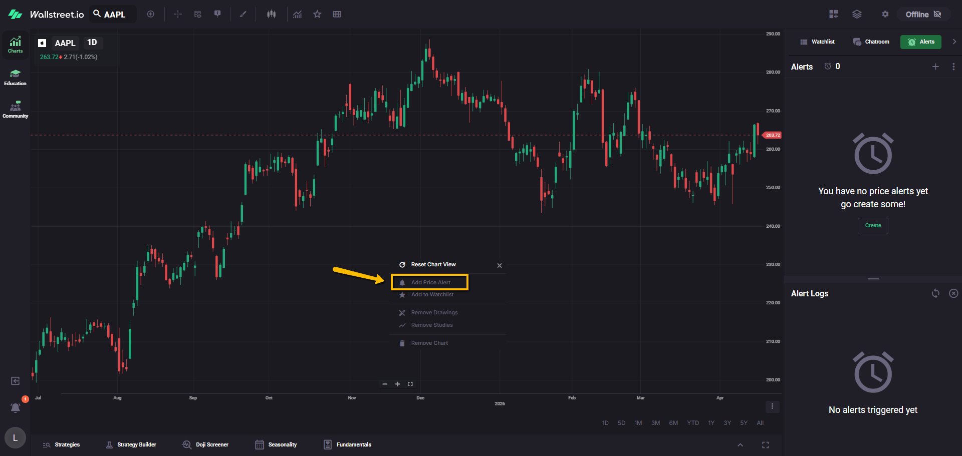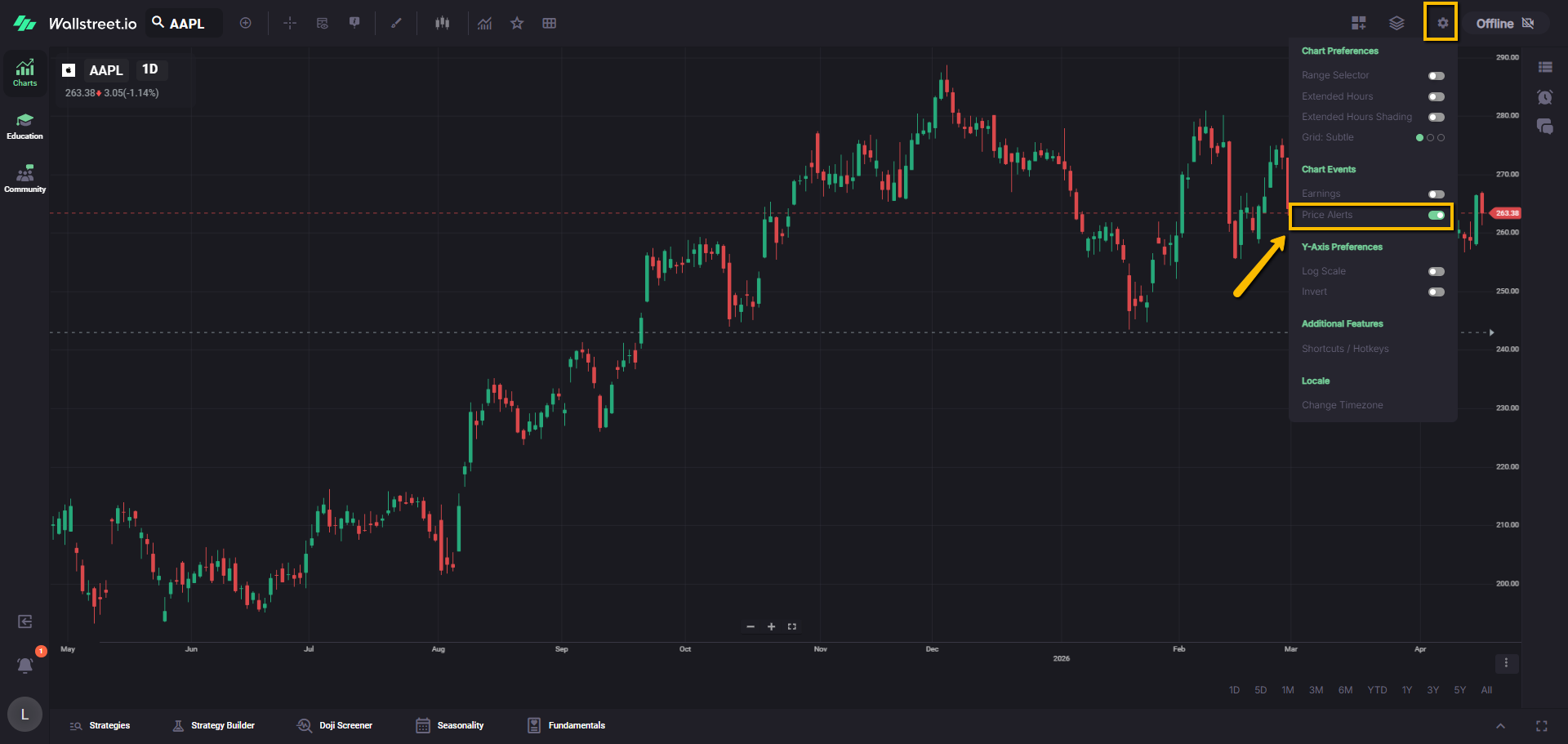 Alert visuals on the chart are enabled by default, but you can turn them off from the Chart Settings menu if you prefer a cleaner chart.