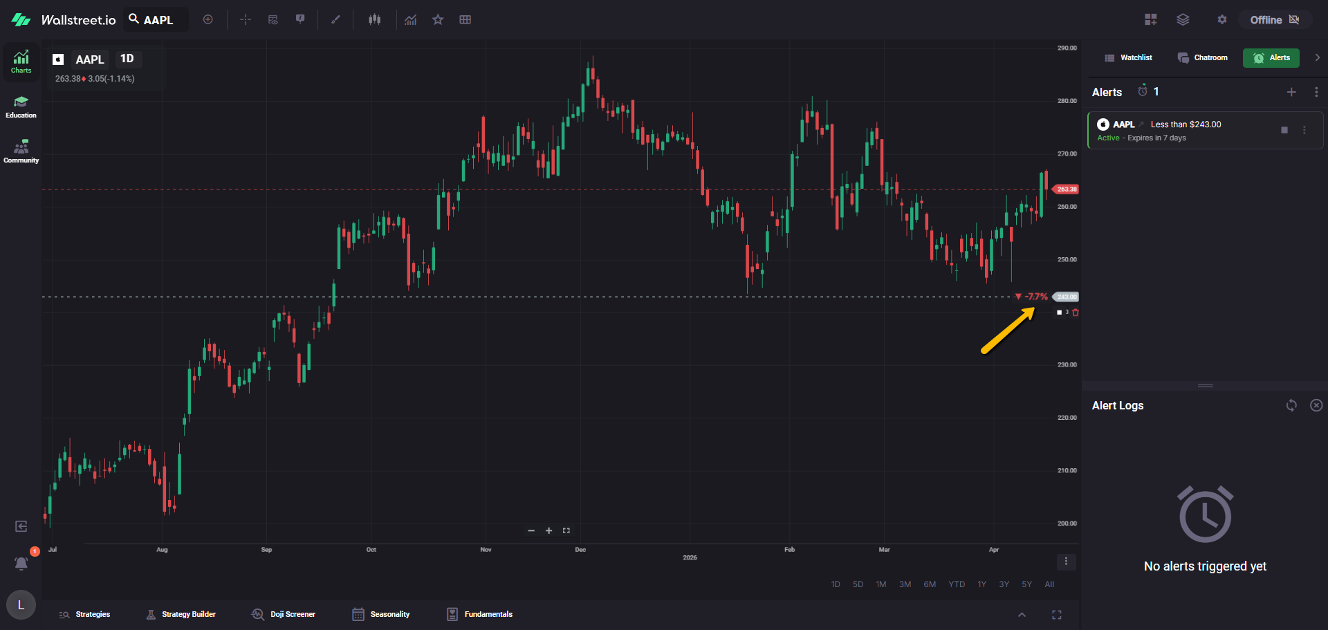 When you hover over an alert line, the chart can display quick details like the alert price and percent distance, plus quick action icons such as Stop and Delete.