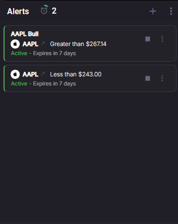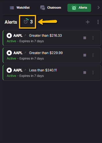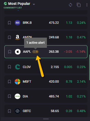 In Watchlists, symbols can show an alert indicator so you can see how many alerts are active for that ticker at a glance.
