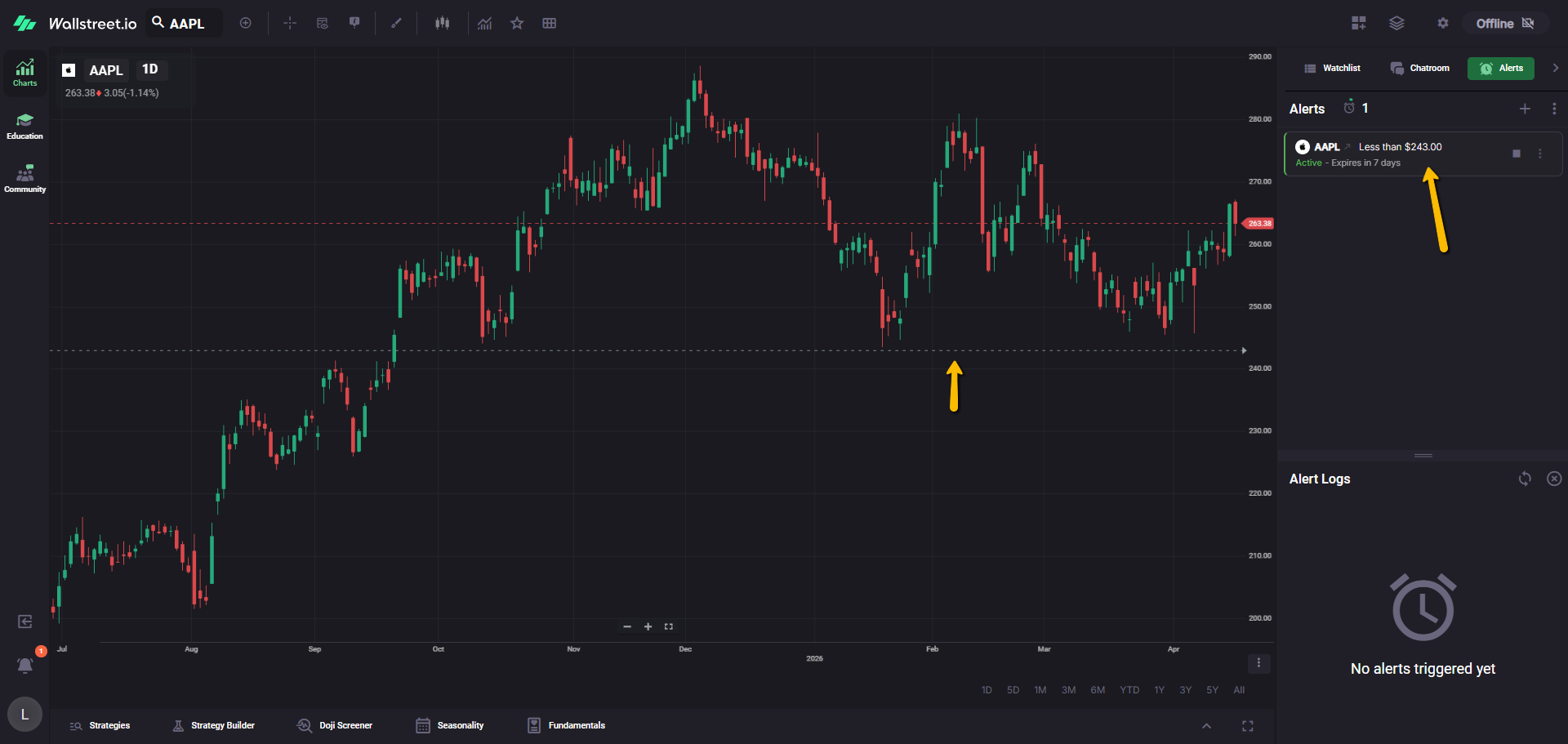 When an alert is active, the platform can display a horizontal alert line on the chart at the alert’s price level. This makes it easy to confirm where your alert sits without opening the Create Alert window again.