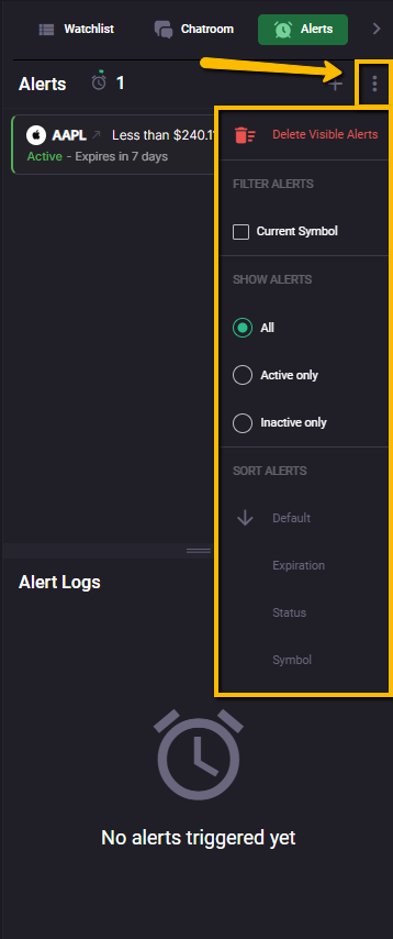 You can also use the alert indicator as a shortcut. Clicking it opens the Alerts panel already filtered to that symbol, so you only see the alerts tied to that ticker.