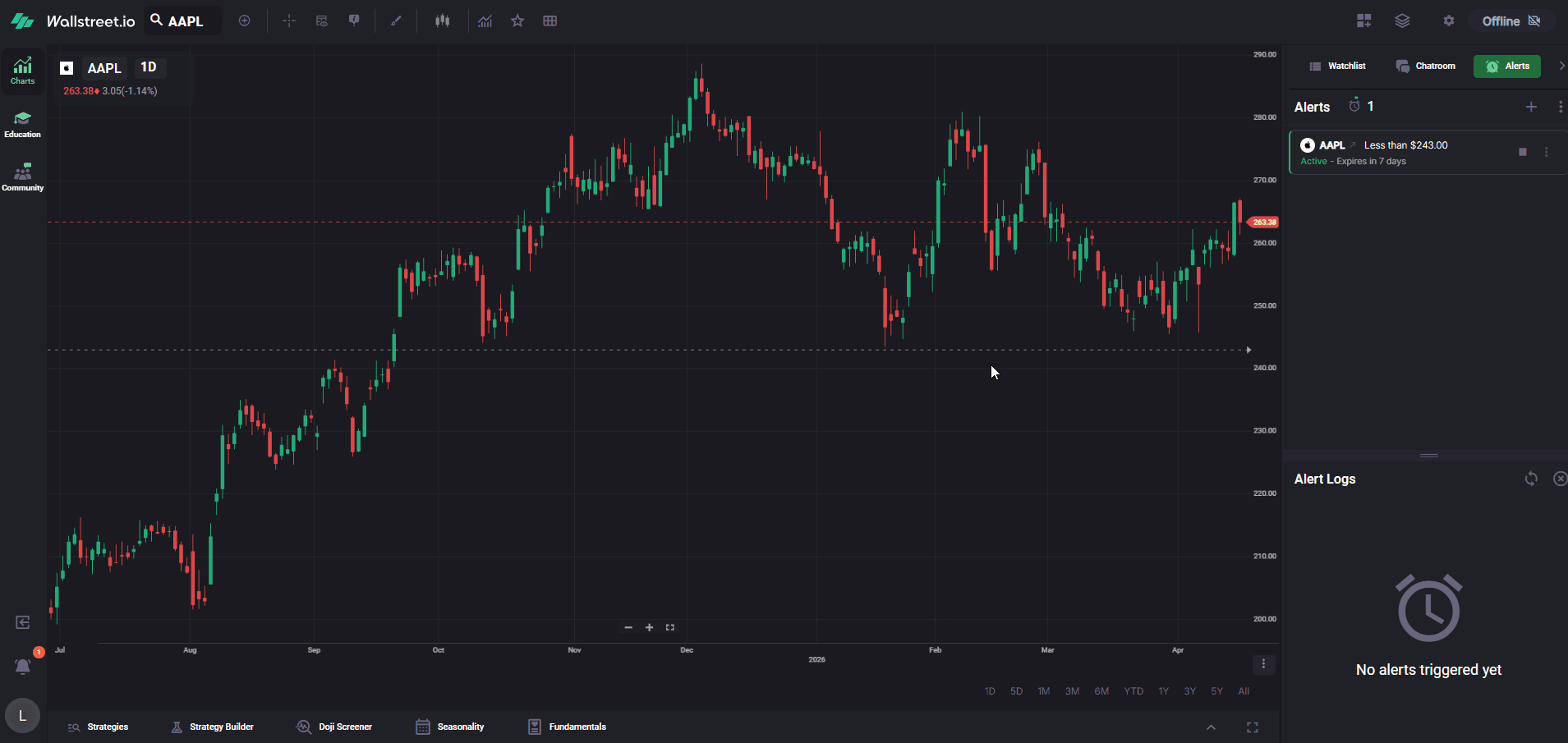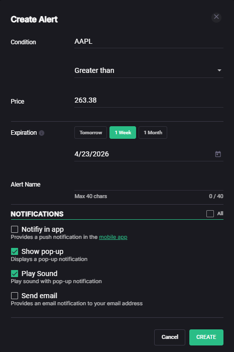 The platform opens the Create Alert flow using that chart level as your starting point, so you can confirm the condition, expiration, and notifications before creating it.