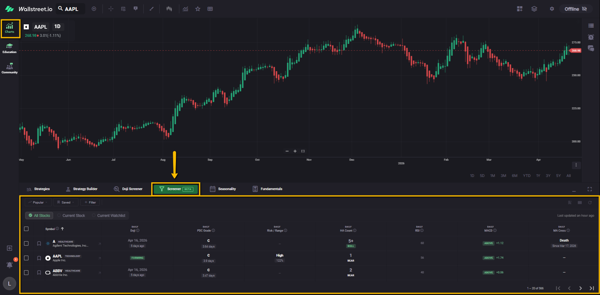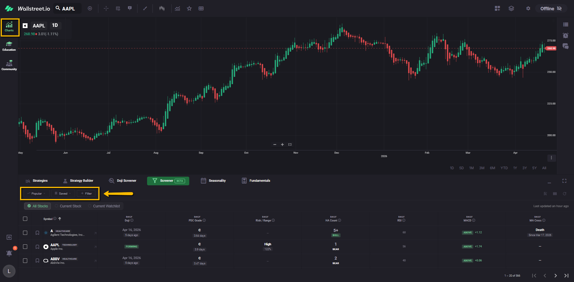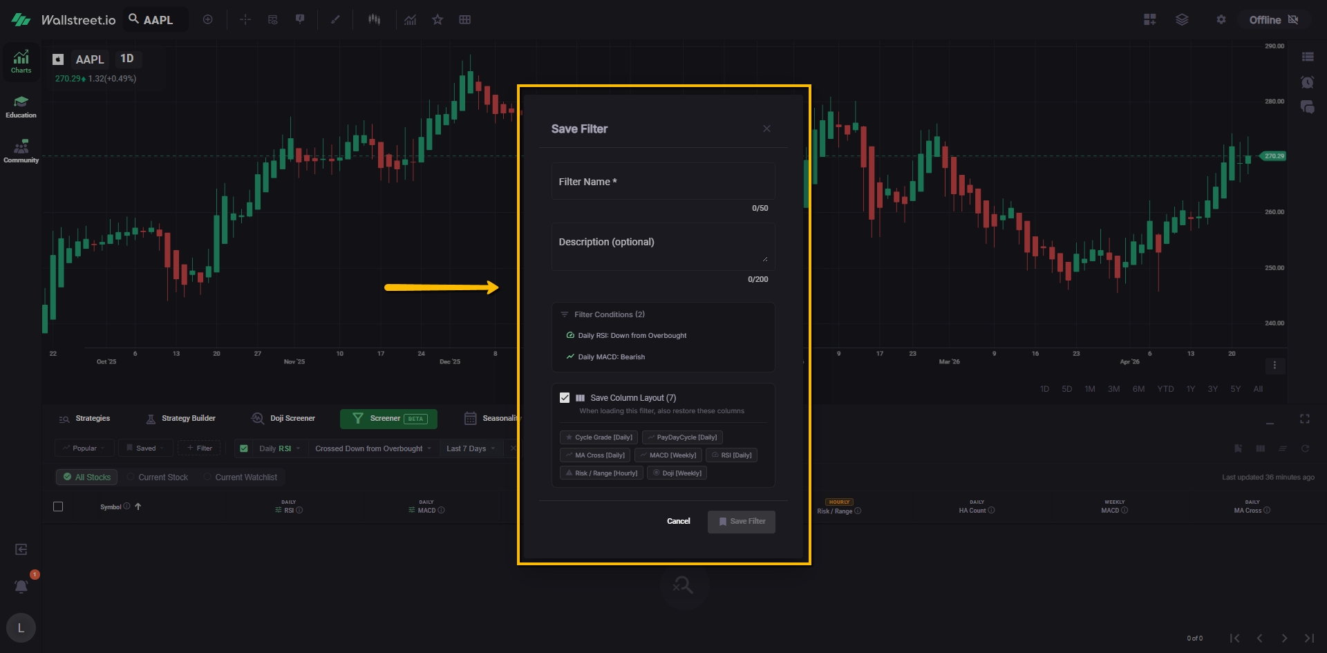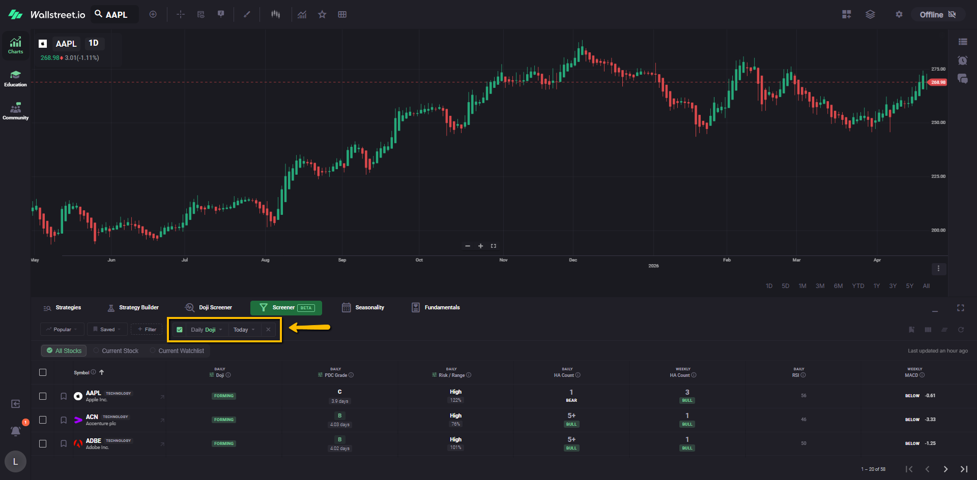 For example, a Daily Doji filter chip tells you the Screener is currently narrowed to symbols matching that Doji condition.