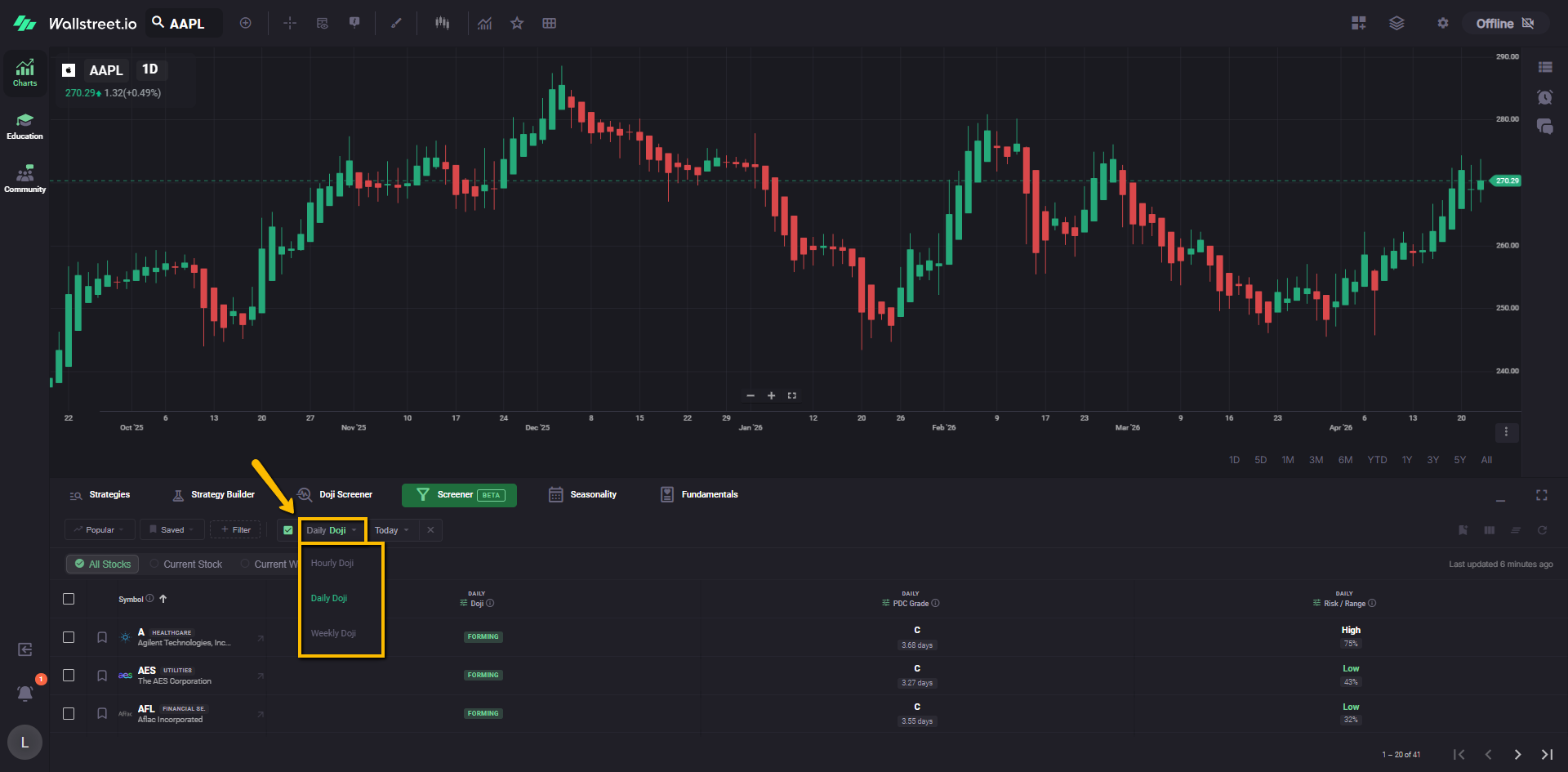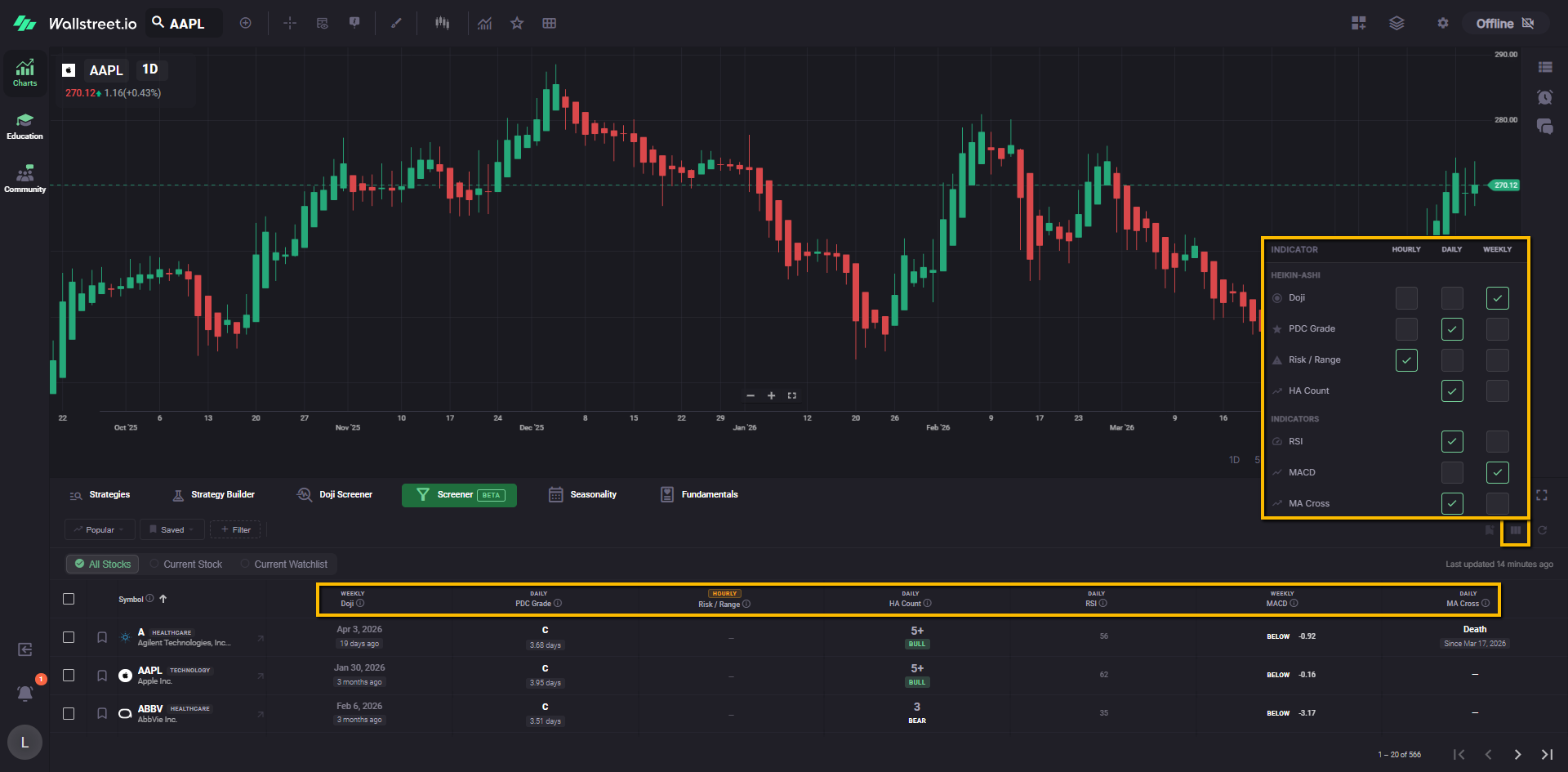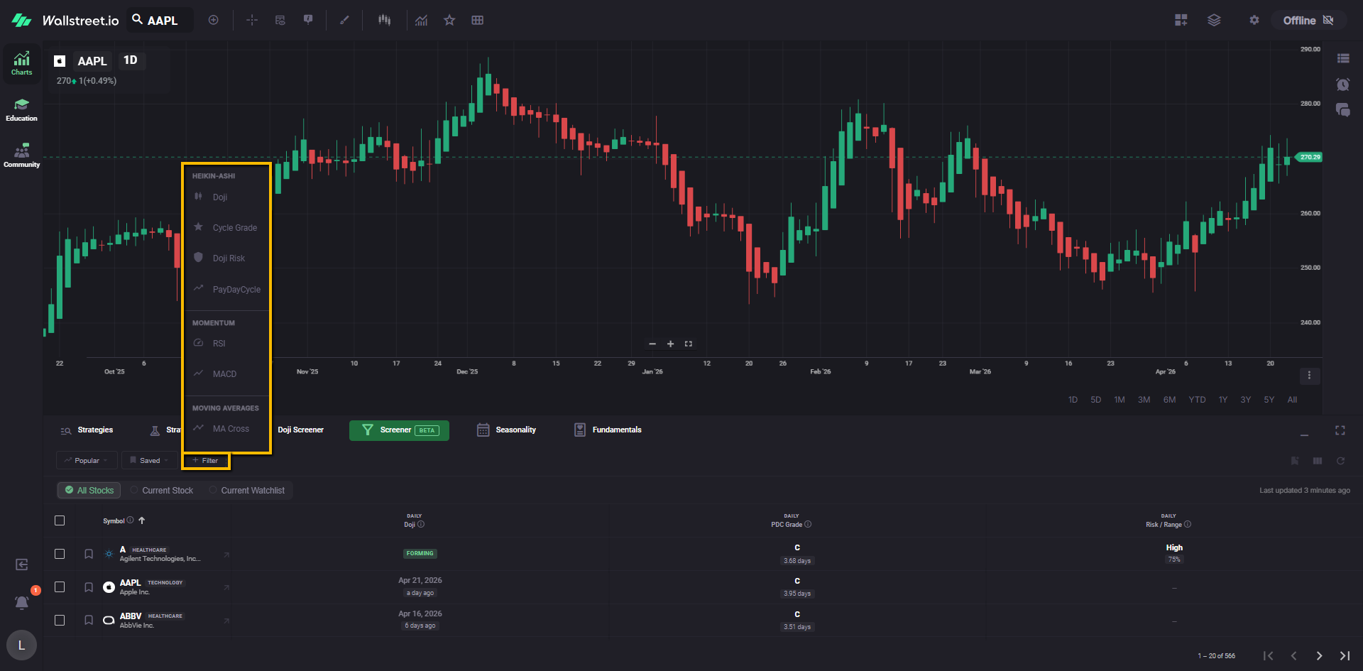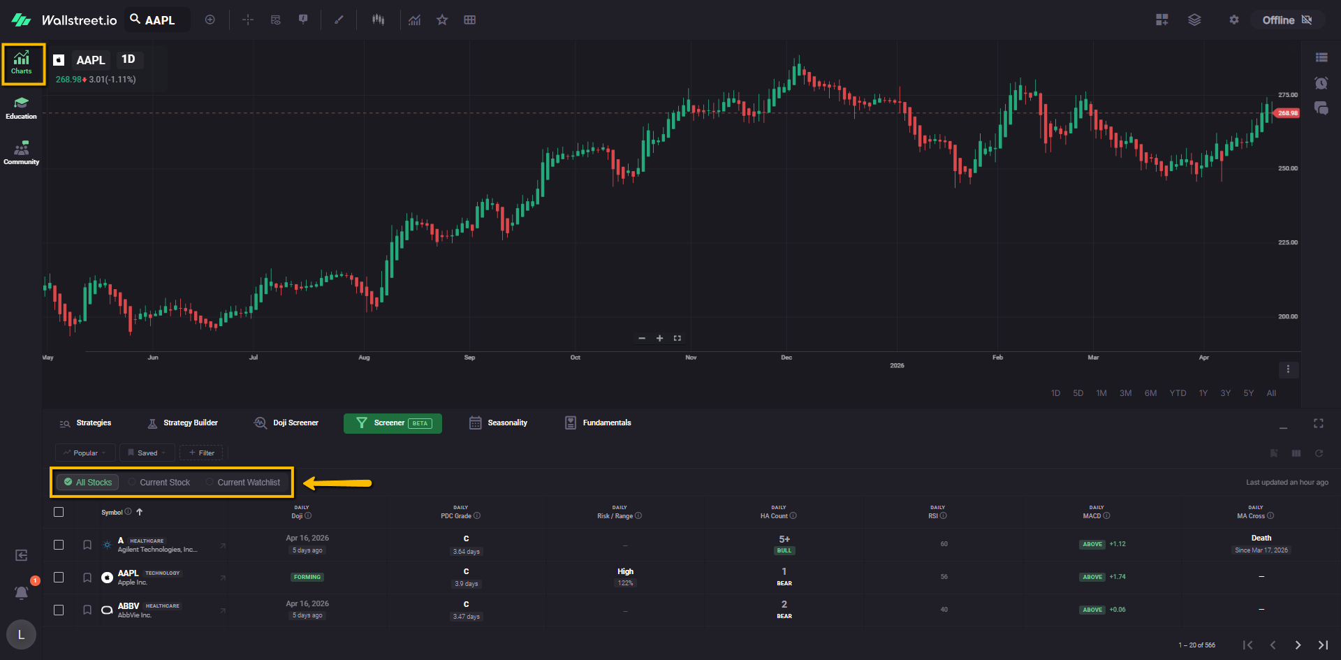 For example, a Daily Doji filter chip tells you the Screener is currently narrowed to symbols matching that Doji condition.