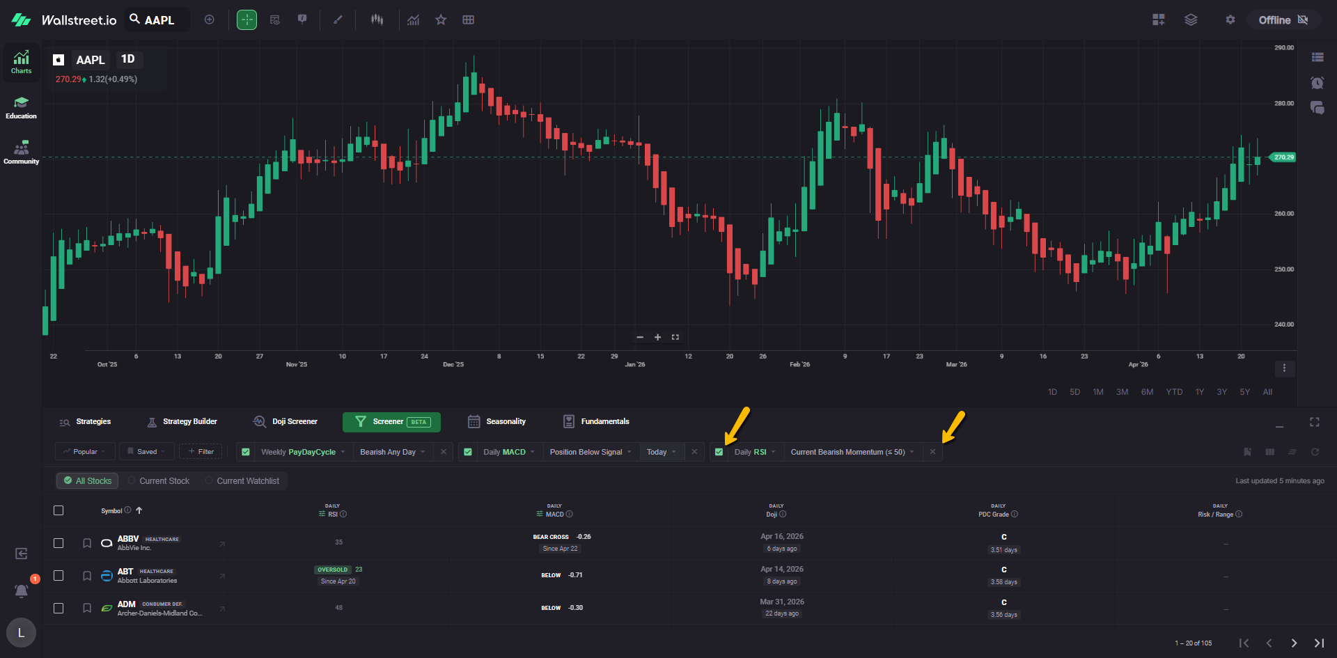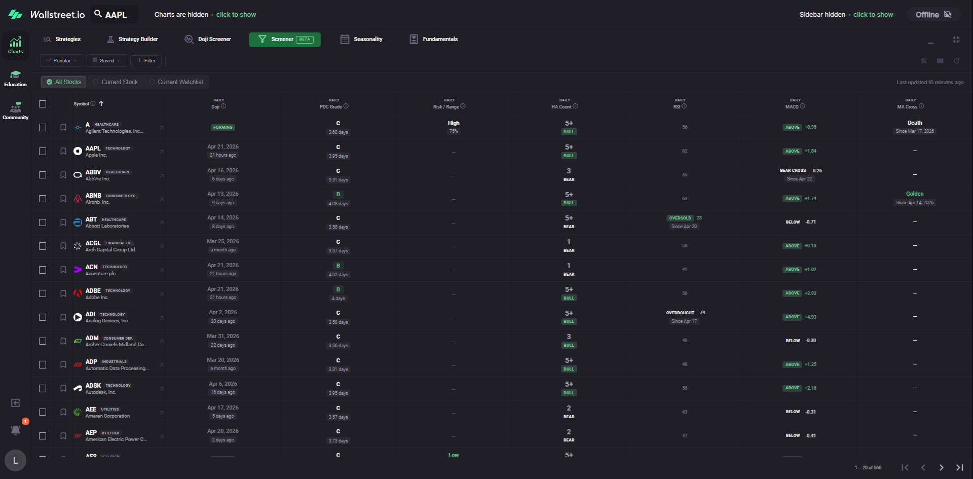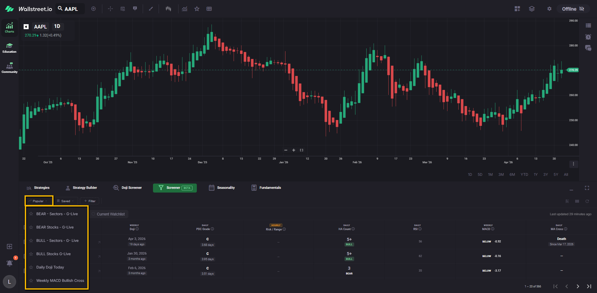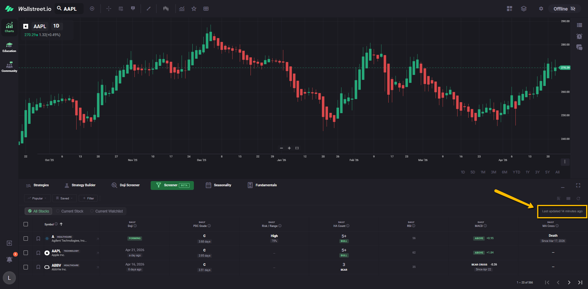For example, a Daily Doji filter chip tells you the Screener is currently narrowed to symbols matching that Doji condition.