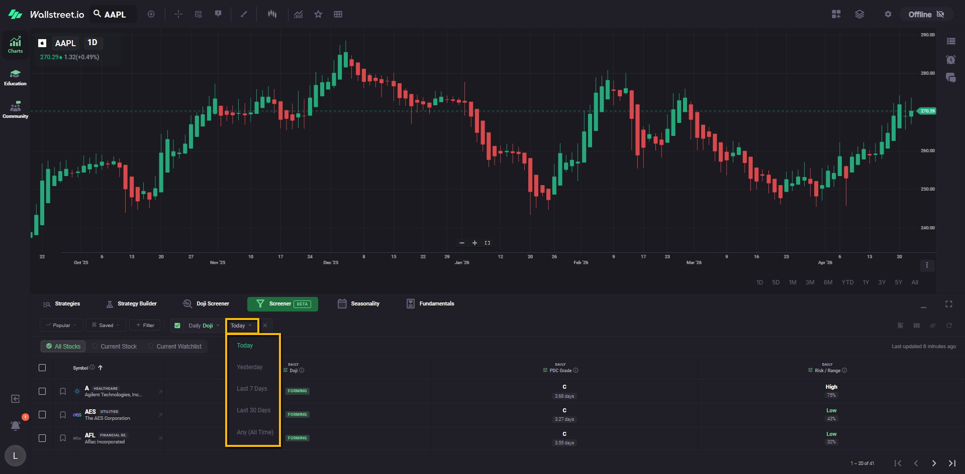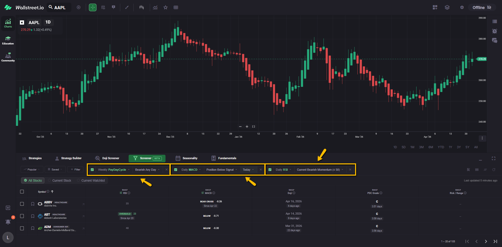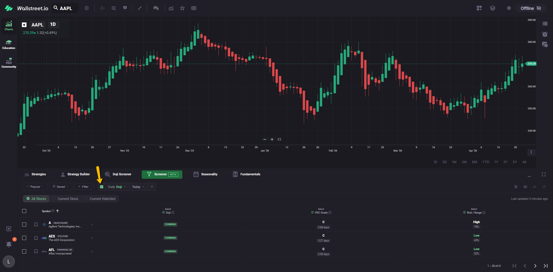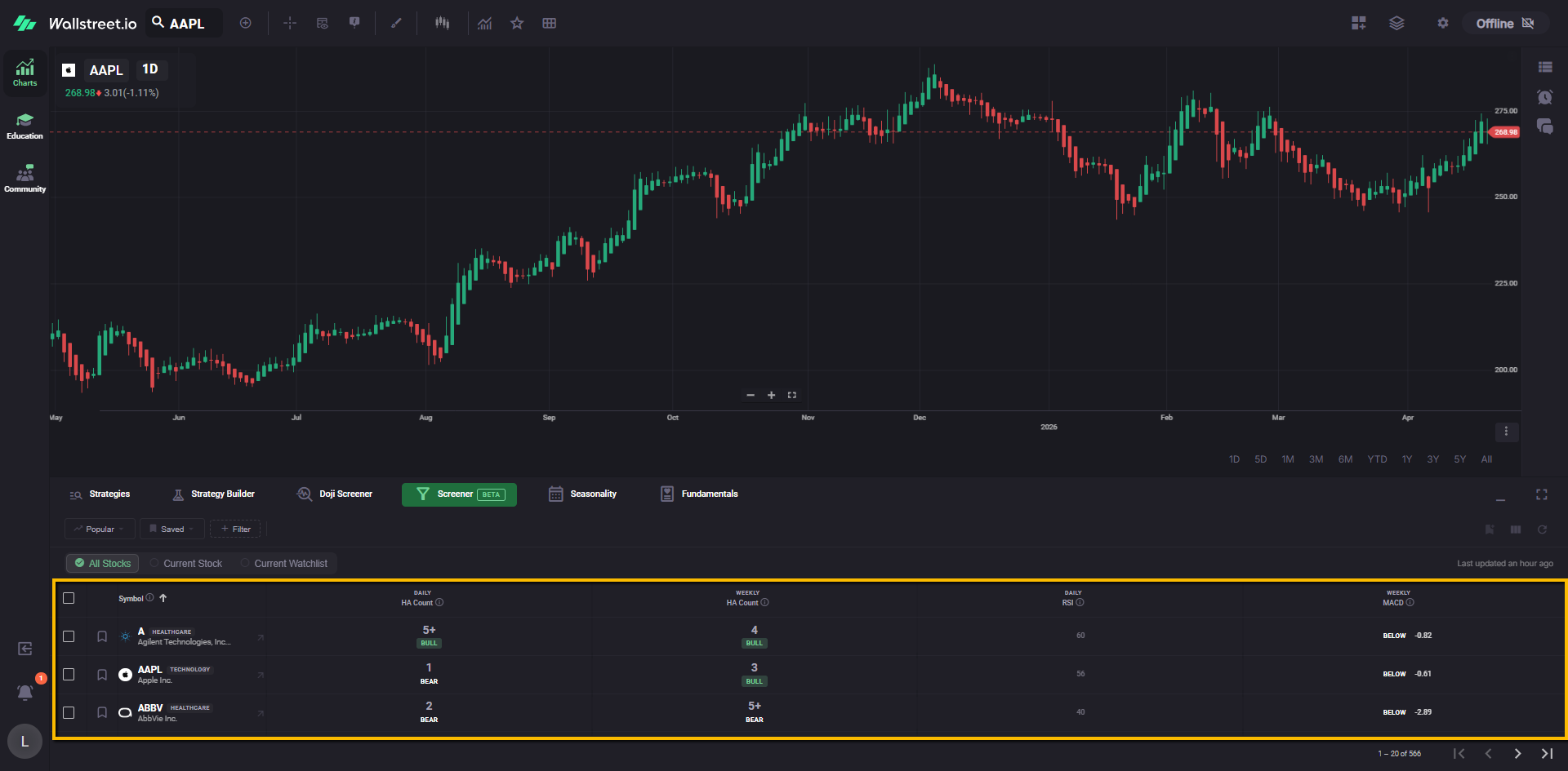 For example, a Daily Doji filter chip tells you the Screener is currently narrowed to symbols matching that Doji condition.