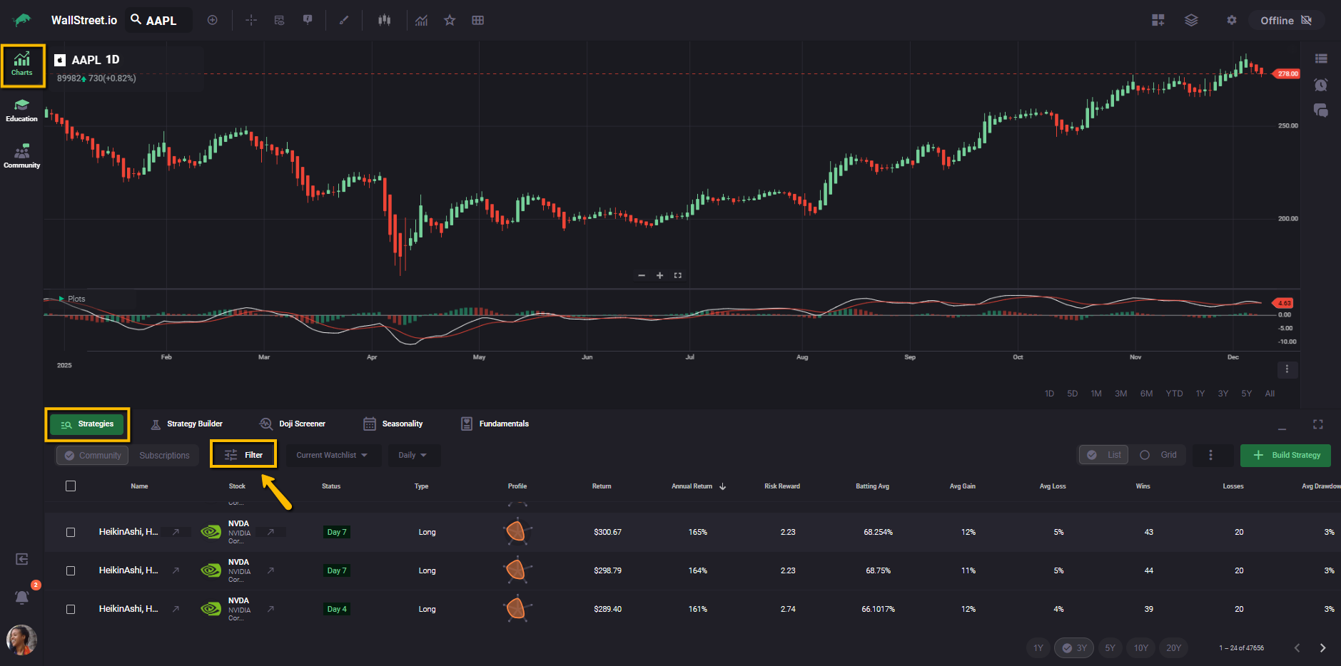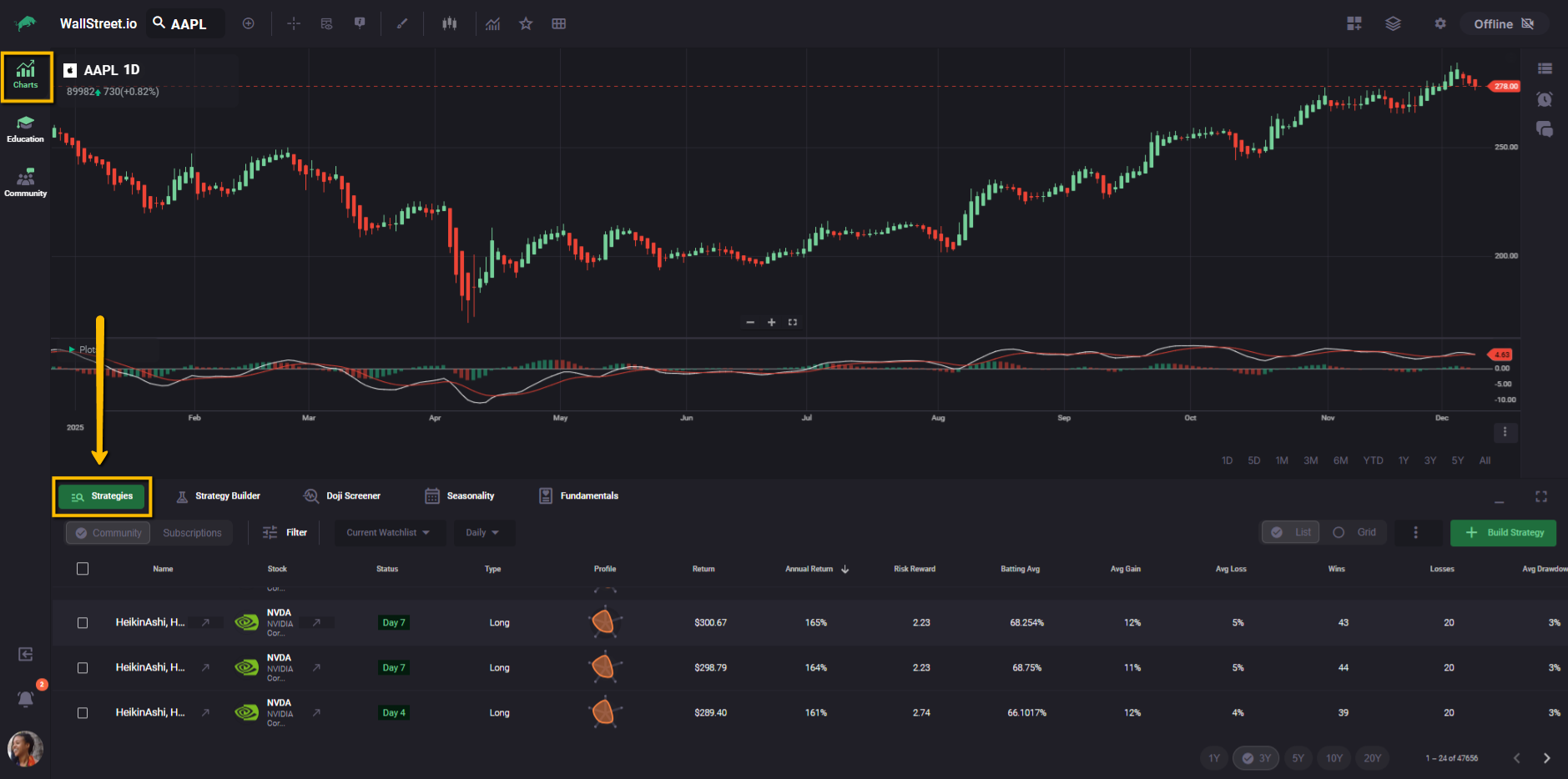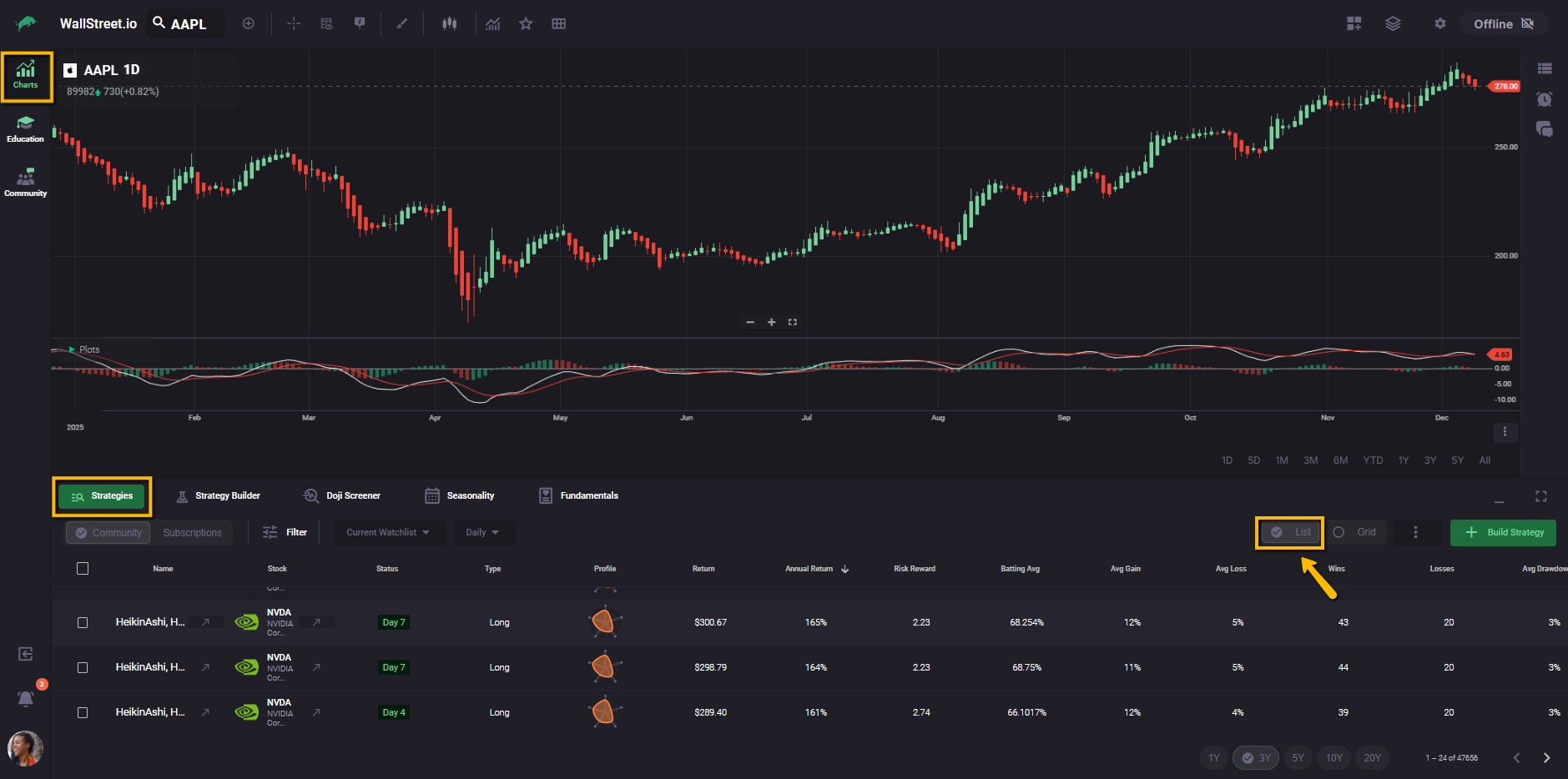 The Strategies tab is your strategy dashboard. It brings together the community’s shared strategies, the ones you subscribe to, and the performance stats that show how each idea has behaved in past markets.