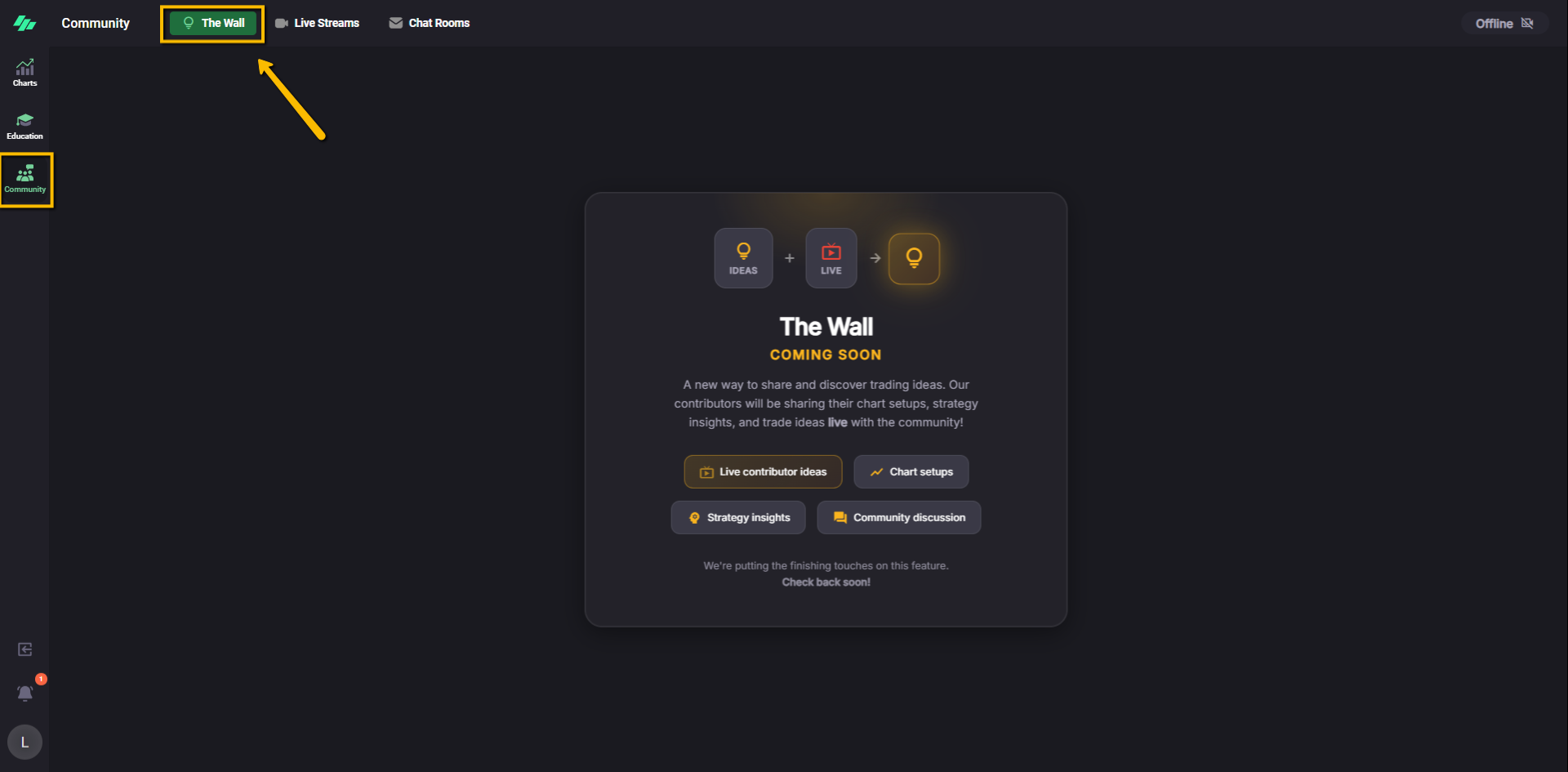 The Community workspace also includes The Wall. This is meant to be a new way to share and discover trading ideas. Our contributors will be sharing their chart setups, strategy insights, and trade ideas live with the community!