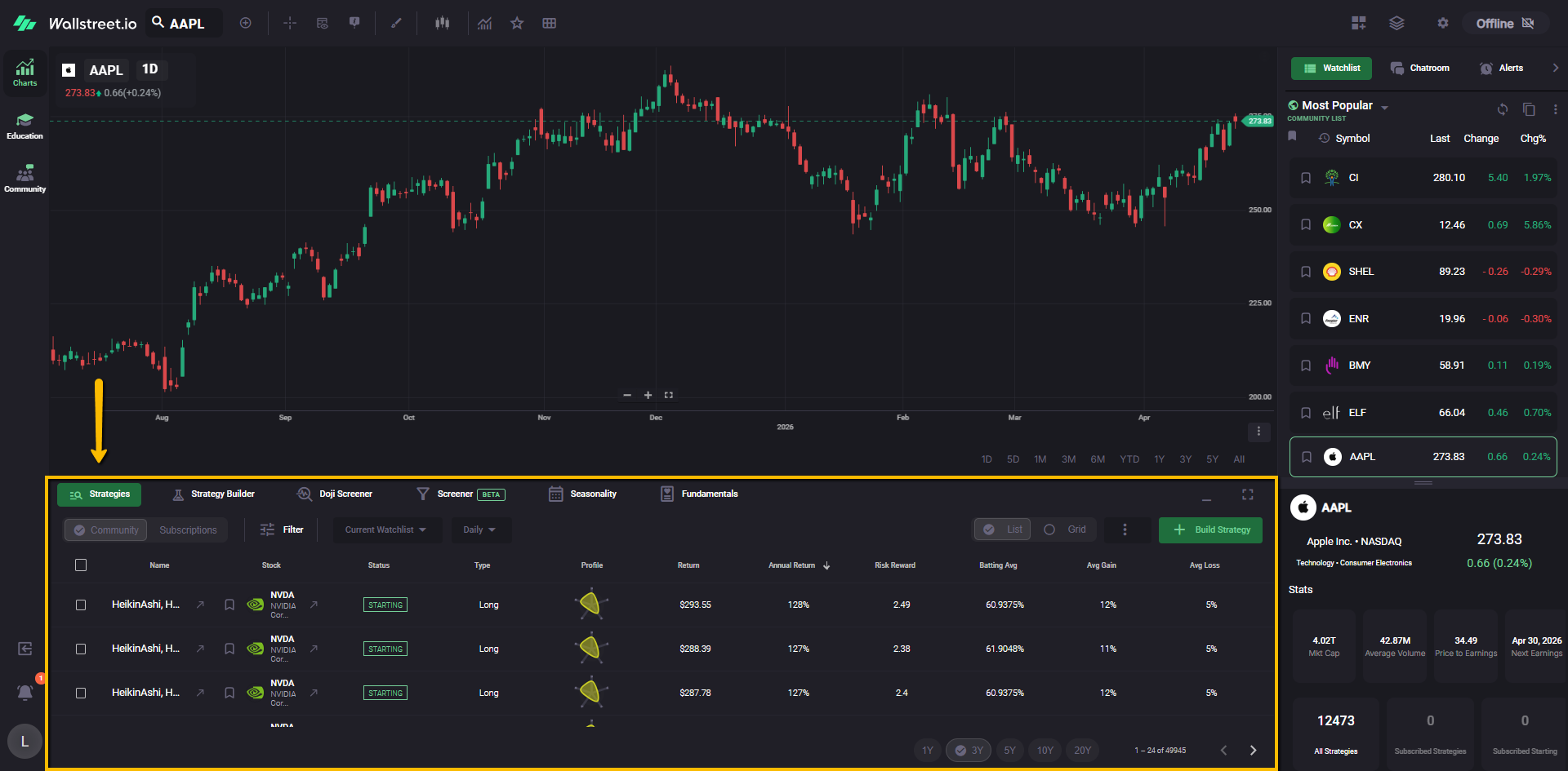 The Strategies tab is where you review strategy results tied to the current symbol, filters, and watchlist context. This area is used to browse available strategies and review strategies you have already subscribed to.
