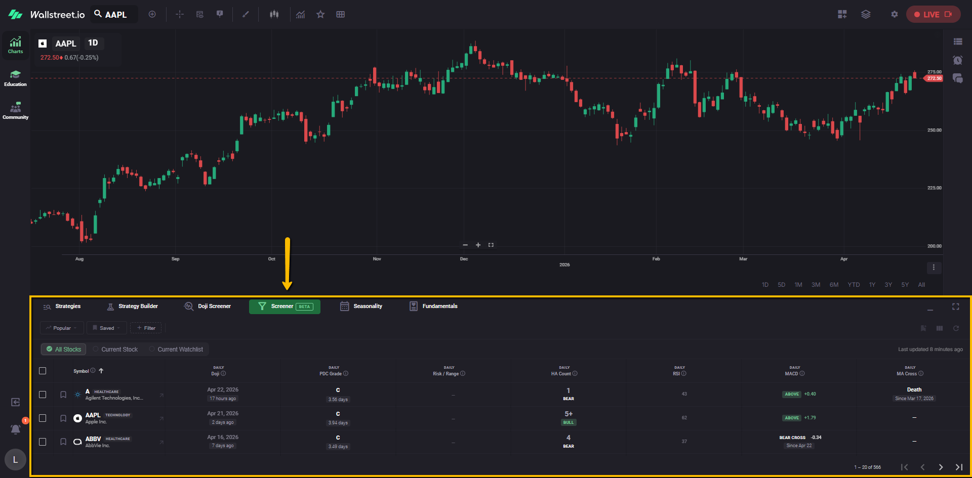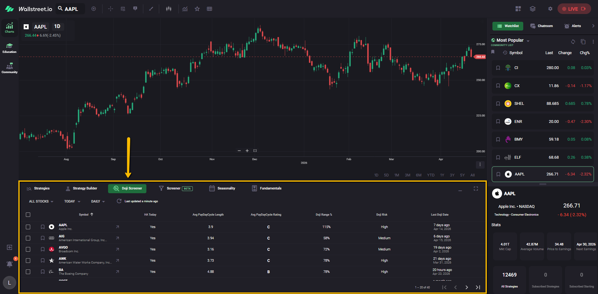 The Doji Screener is where you review doji-based opportunities surfaced by the platform. It is designed to help you spot potential setups tied to Heikin-Ashi doji breakouts.