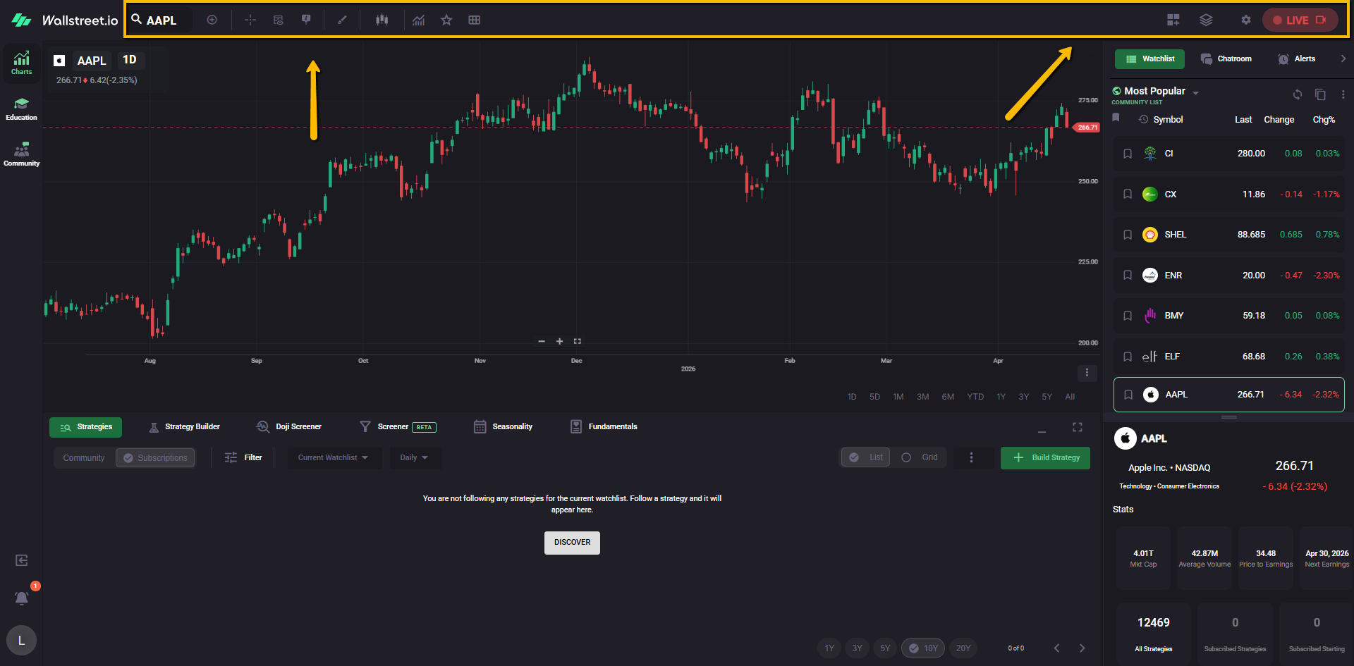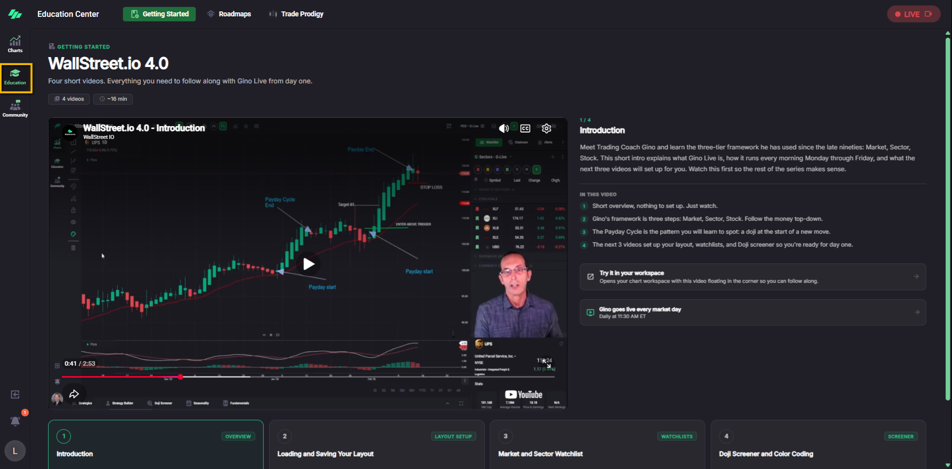 WallStreet.io 4.0 is organized into separate workspaces for charting, education, and community. It matters because once you know how those pieces fit together, the platform becomes much easier to navigate and use with confidence.
