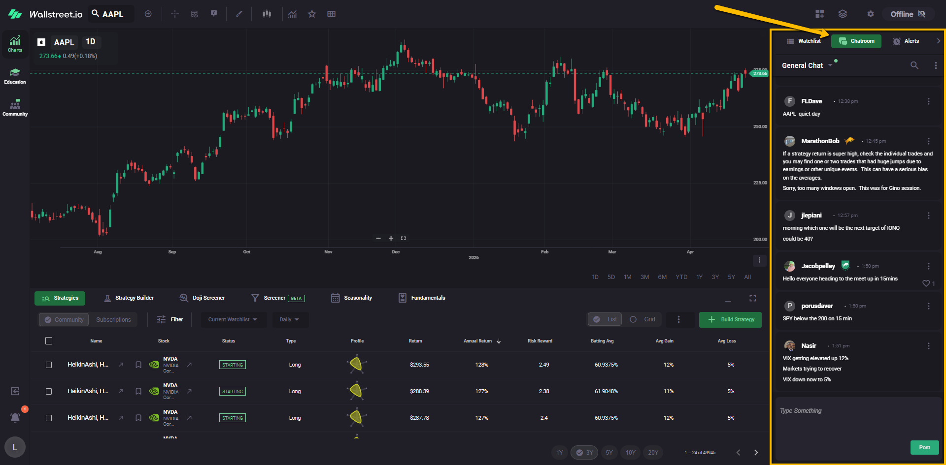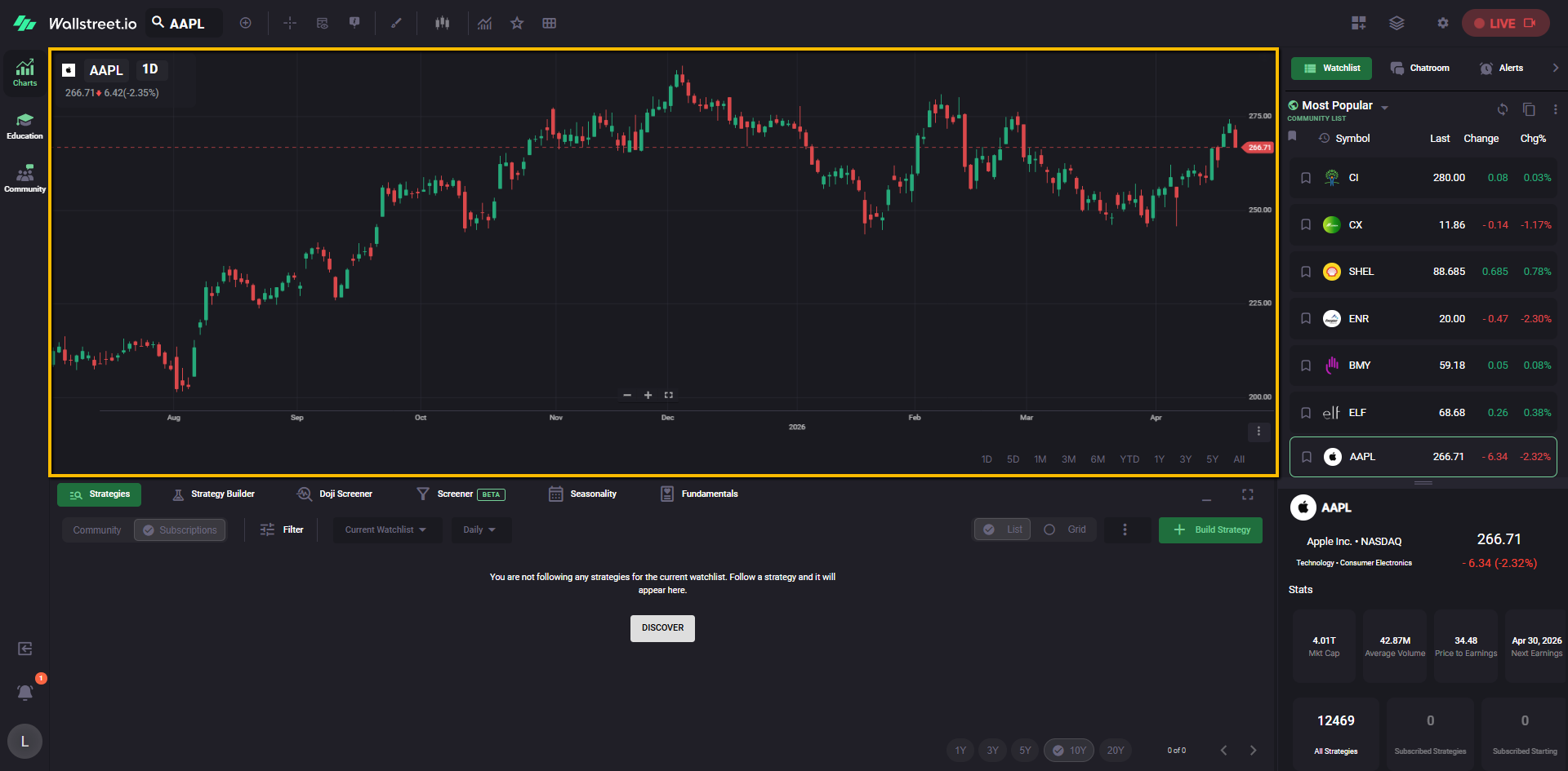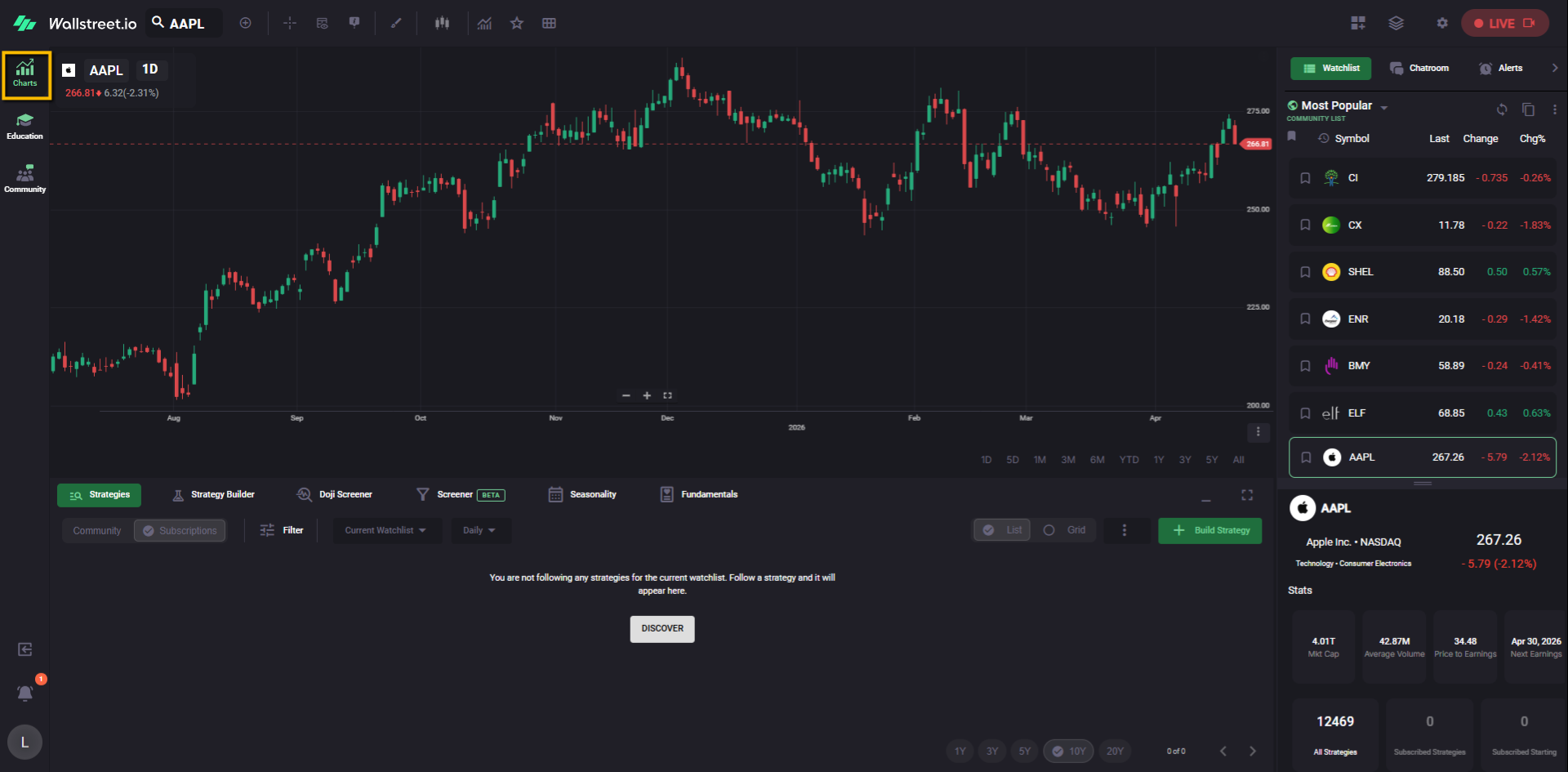 The Charts workspace is the main analysis area and the default workspace you see when you log in. This is where you review symbols, use the chart, explore strategies, open the Strategy Builder, access tools like the Doji Screener, Seasonality, and Fundamentals, and work with right-side utilities such as Watchlists, Chatroom, and Alerts.