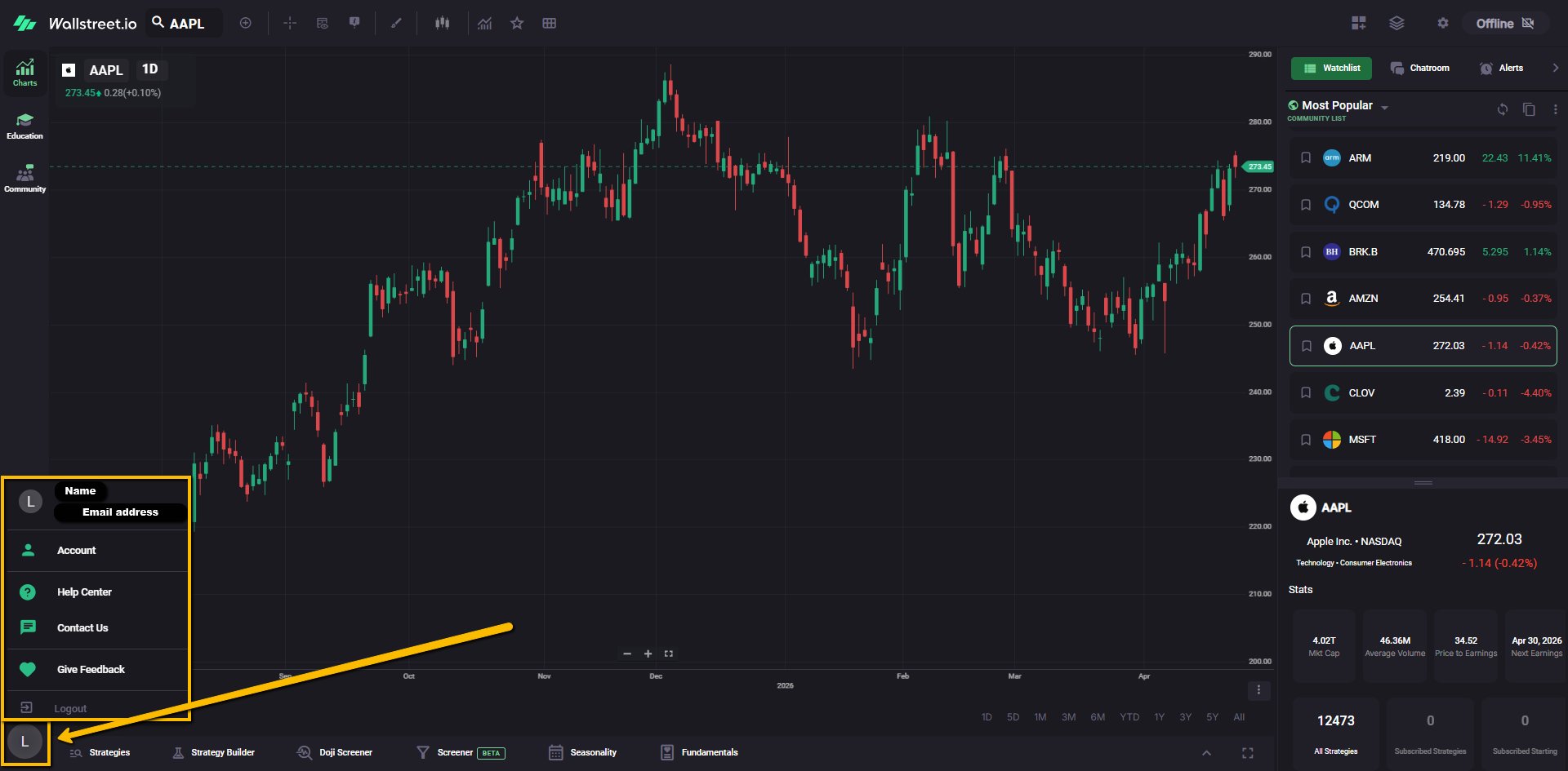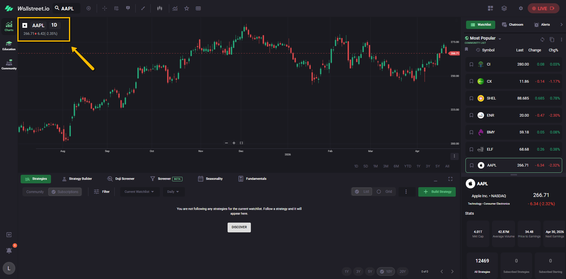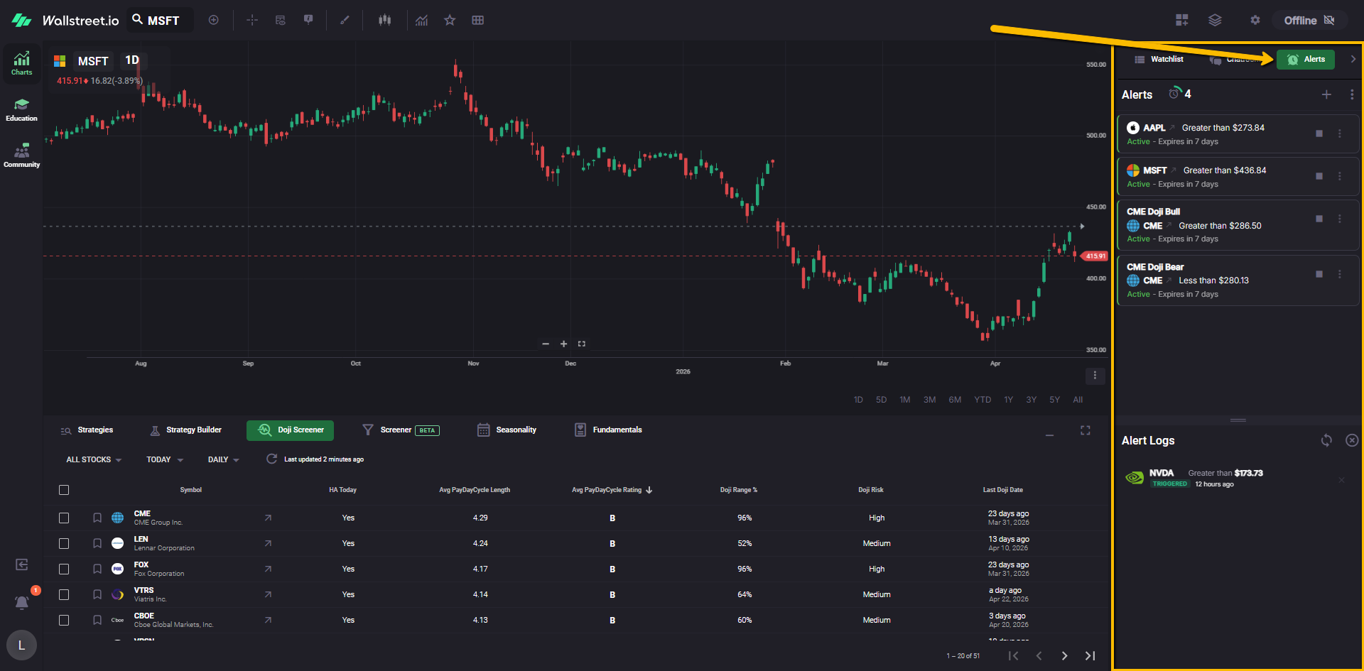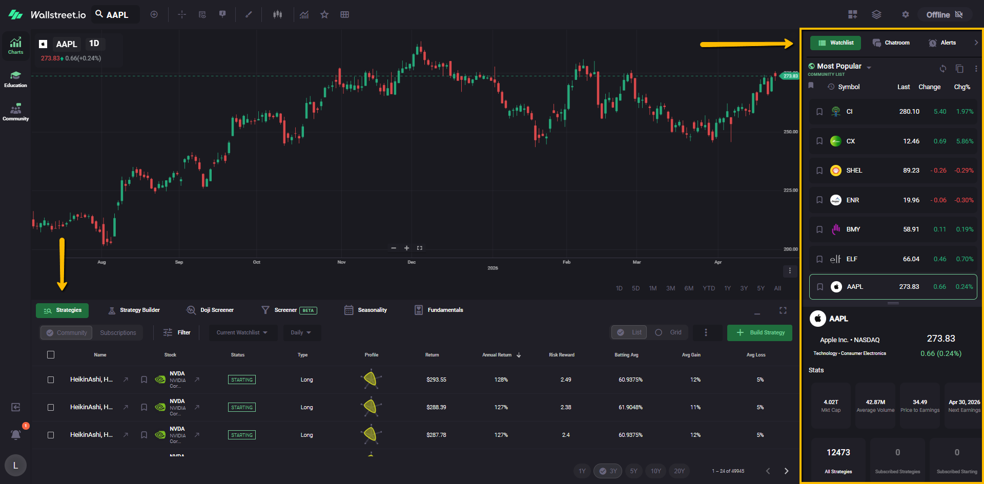 The Charts workspace is the main analysis area and the default workspace you see when you log in. This is where you review symbols, use the chart, explore strategies, open the Strategy Builder, access tools like the Doji Screener, Seasonality, and Fundamentals, and work with right-side utilities such as Watchlists, Chatroom, and Alerts.