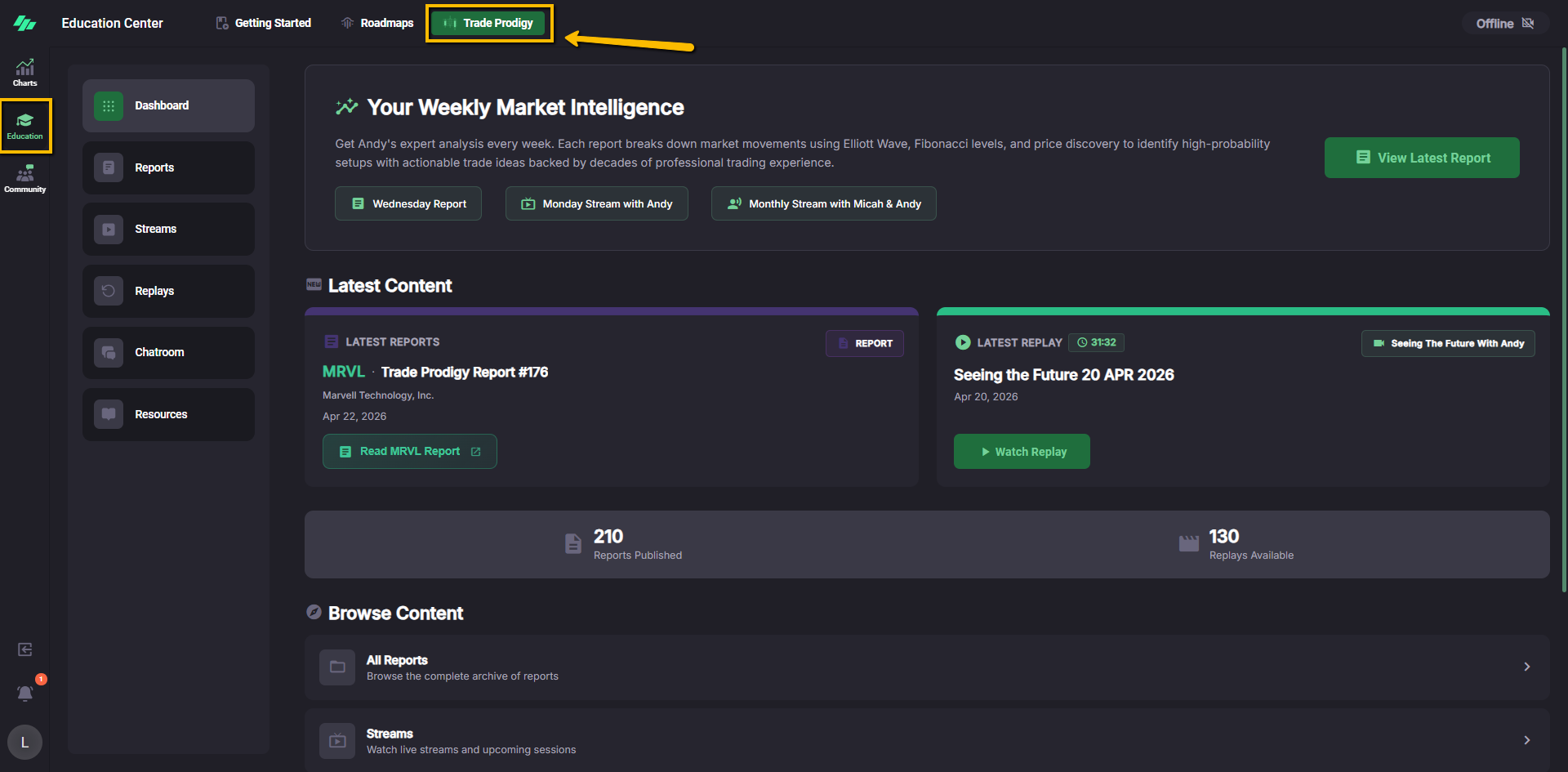 The Education workspace can also include additional learning offerings, such as mentorship programs and other educational content. For example, areas such as Trade Prodigy may appear here as part of the available education experience.