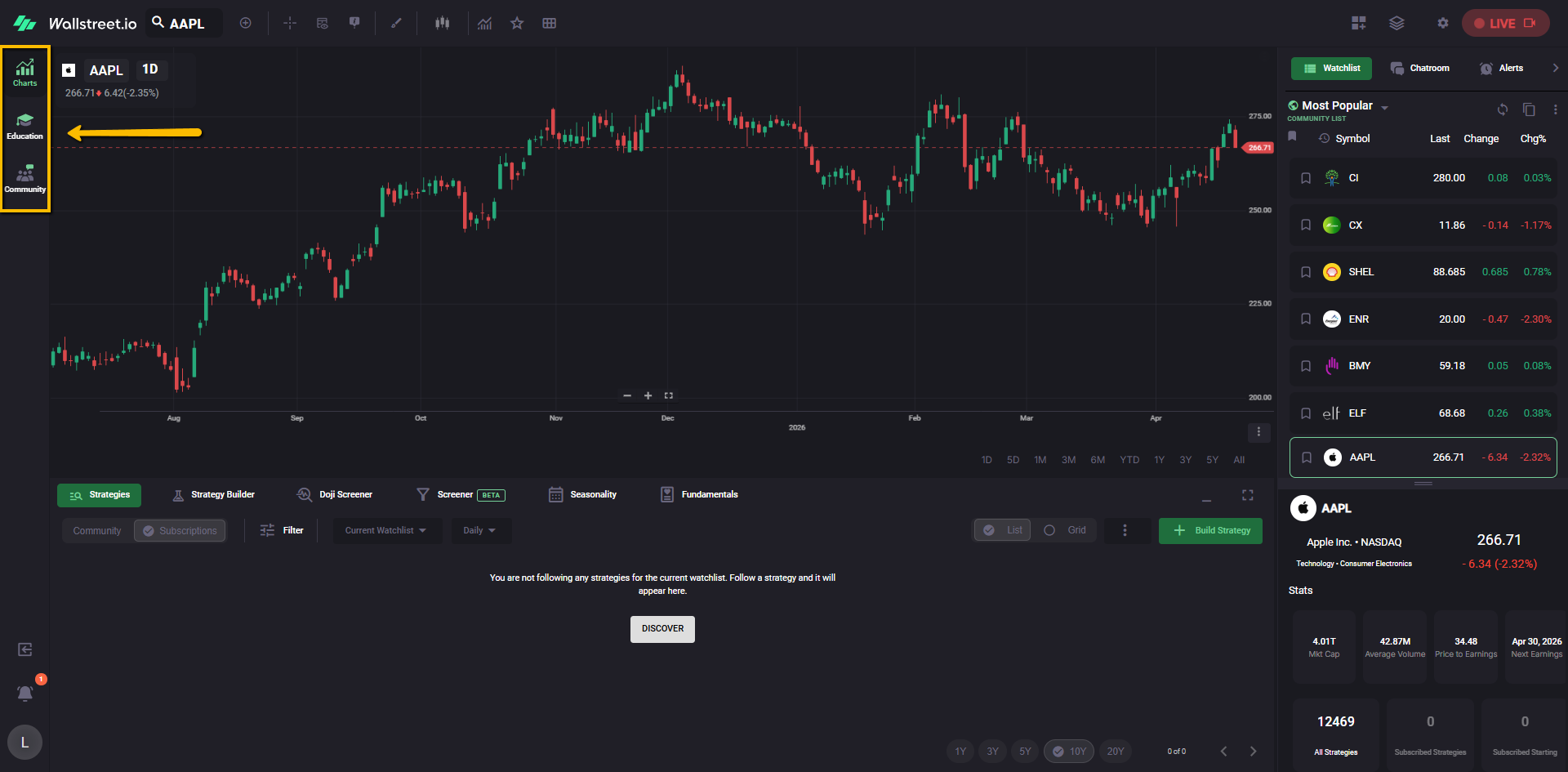 The left side of the platform contains the workspace navigation. This is where you switch between Charts, Education, and Community.