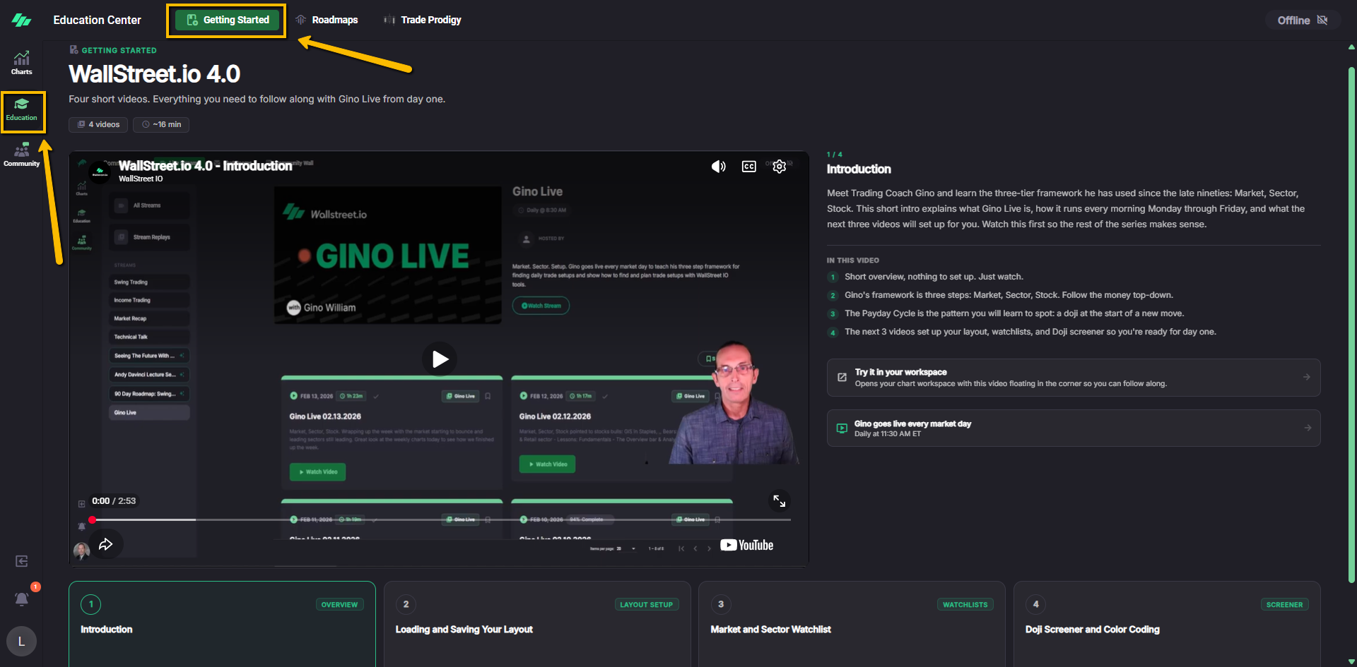 The Education workspace is where you access guided learning content. It opens with the Getting Started area, which includes a four-video series designed to help you follow along with Gino from day one. This workspace is also where educational programs such as Roadmaps and other learning offerings are found.