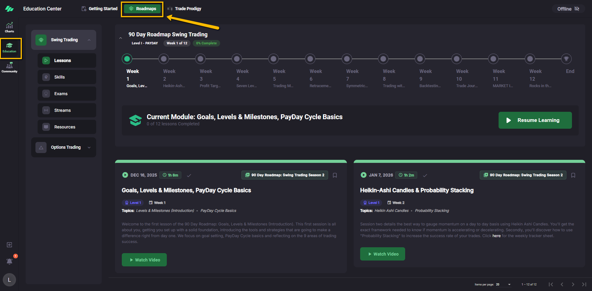 The Roadmaps area is also found inside the Education workspace. This is where users can access Roadmap programs and related educational material available through the platform.