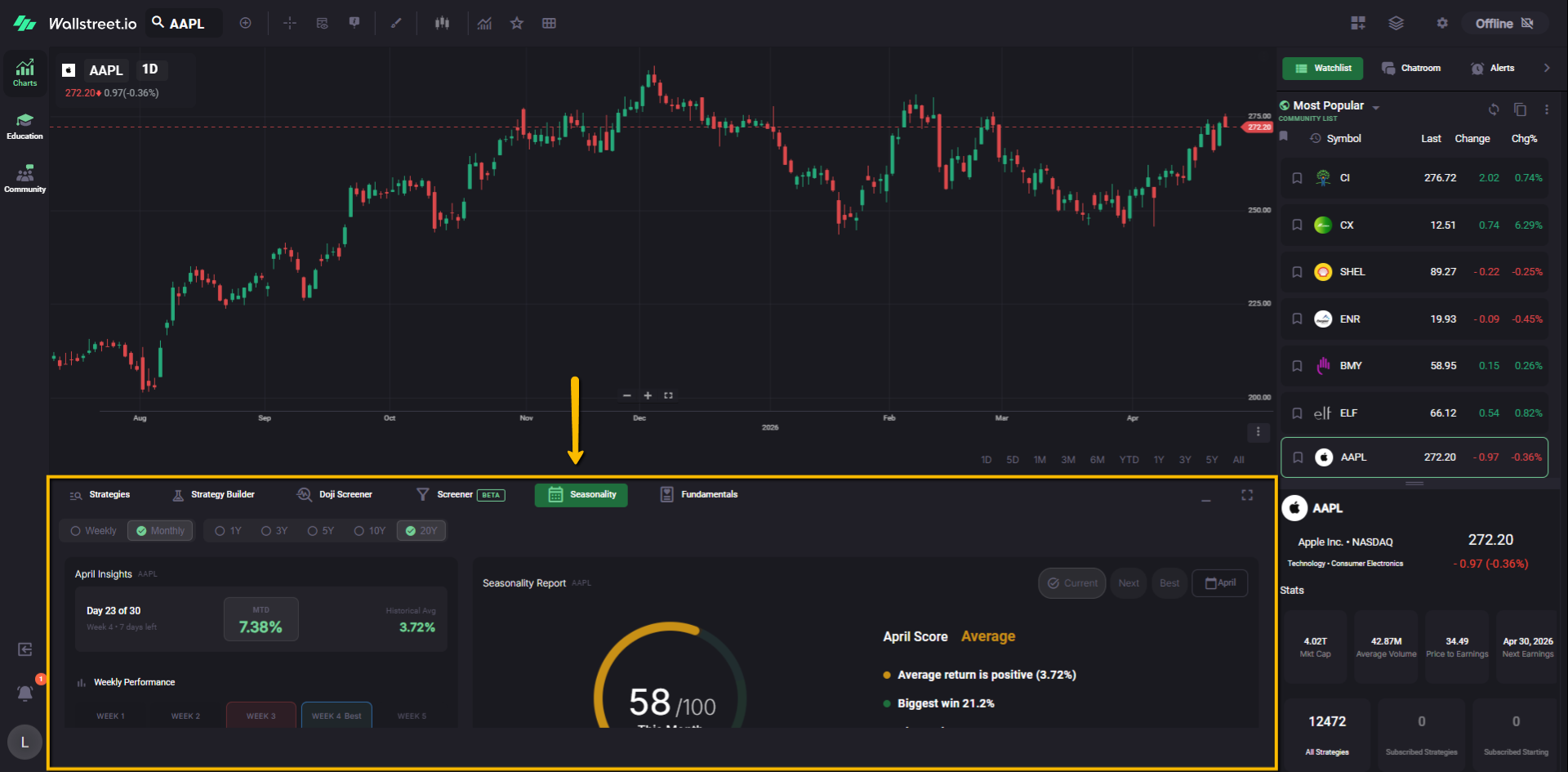 The Seasonality tab is where you review historical seasonal behavior for a symbol. This area helps you study how a stock has tended to behave across time.