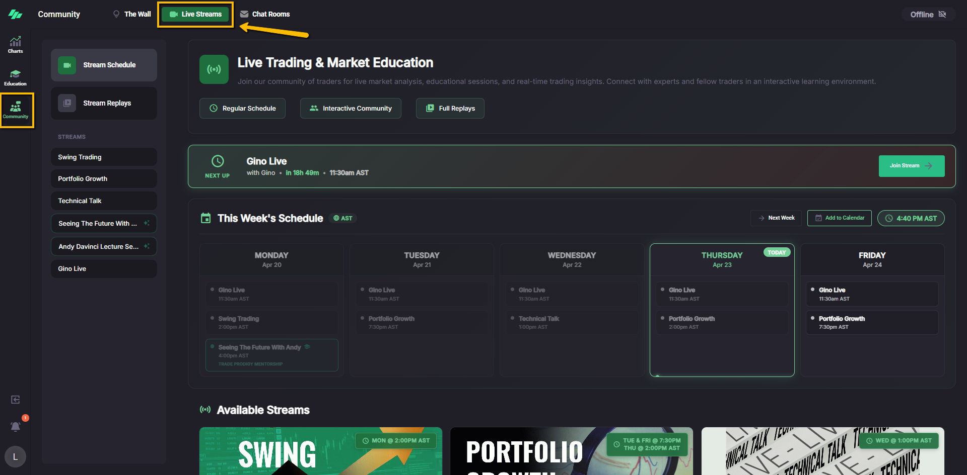 When you open Community, the workspace opens with the Live Streams section. This area includes the stream schedule, upcoming sessions, available streams, and replay access.