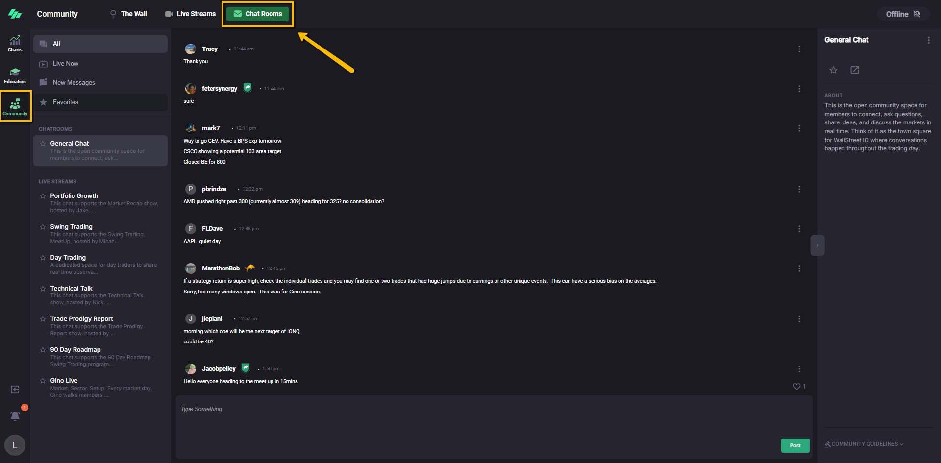 The Community workspace is where you access live and interactive community features. It opens with Live Streams, where you can review the stream schedule, available streams, and replays. This workspace also includes Chat Rooms, and it includes The Wall.