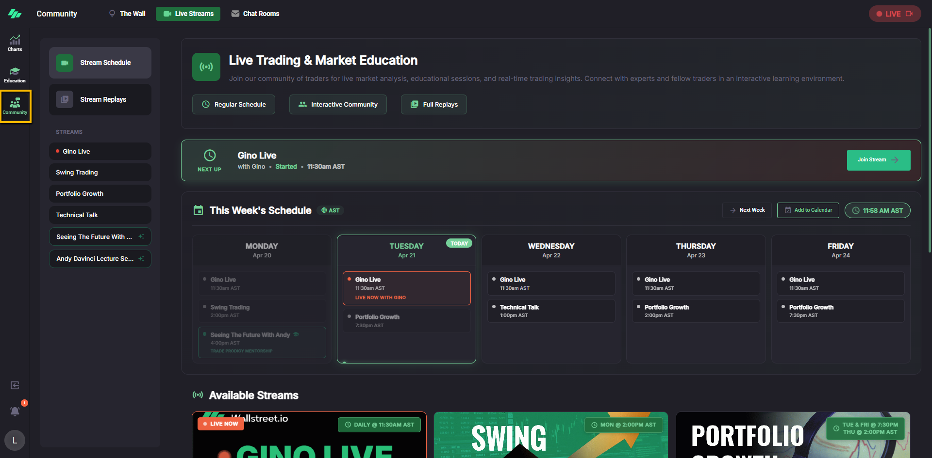 The Community workspace is where you access the platform’s live and interactive community features. This area brings together scheduled streams, replays, and other community spaces designed to help users stay connected to the broader WallStreet.io experience.