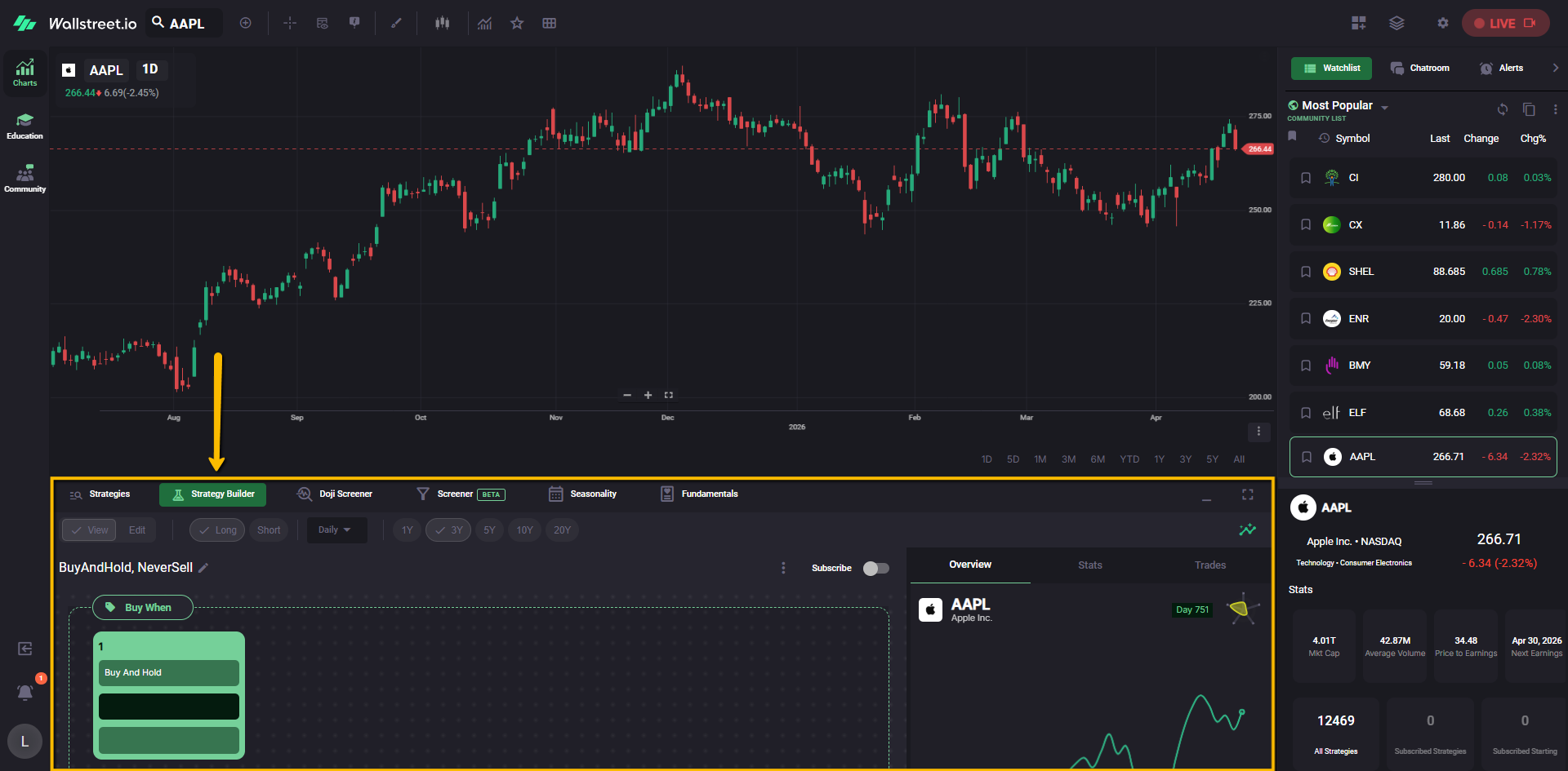 The Strategy Builder is where you create and test your own rules-based strategies. This is the platform area built for custom strategy logic and backtesting workflows.